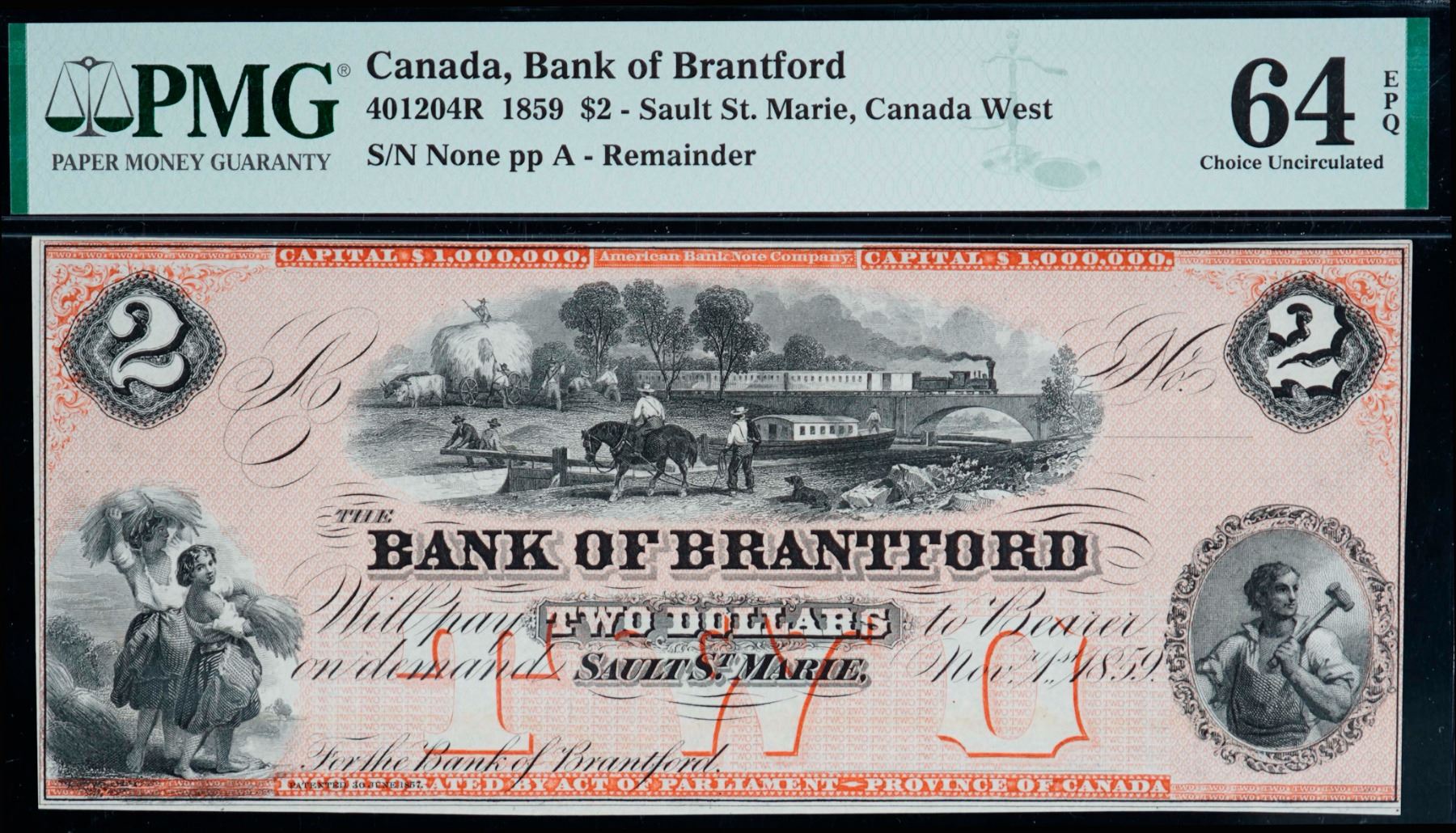 The Bank of Brantford; 1859 $2 CH-40-12-04R, PMG Choice Uncirculated-64EPQ.