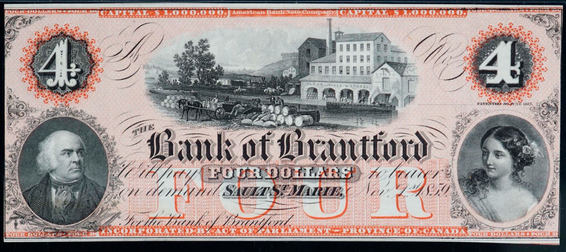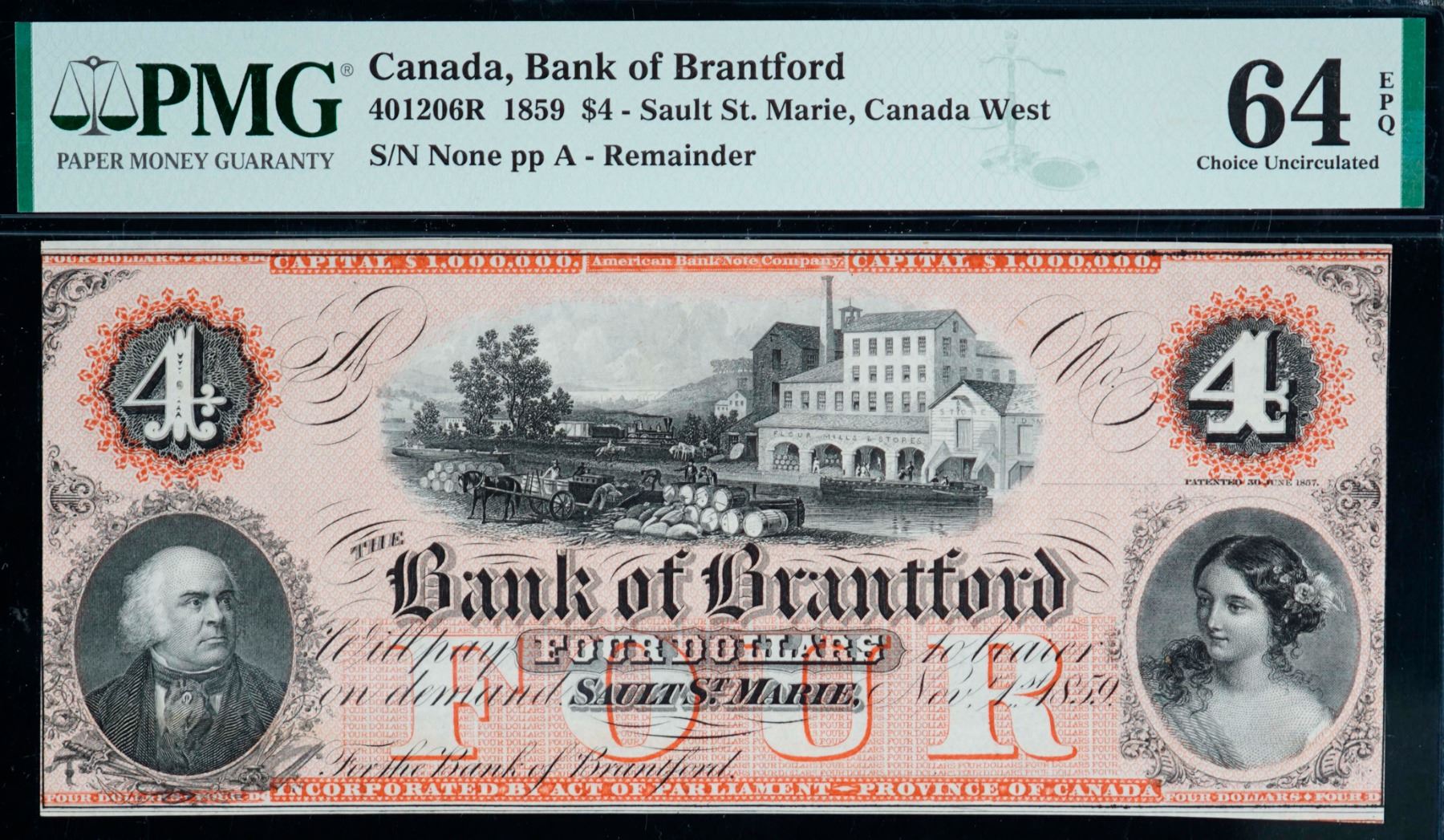 The Bank of Brantford; 1859 $4 CH-40-12-06R, PMG Choice Uncirculated-64EPQ.