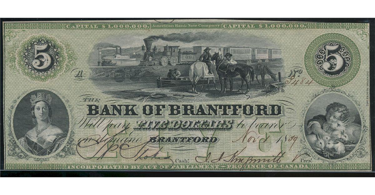 The Bank of Brantford; 1859 $5 #3484 CH-40-10-02-08. Crisp AU issue.
