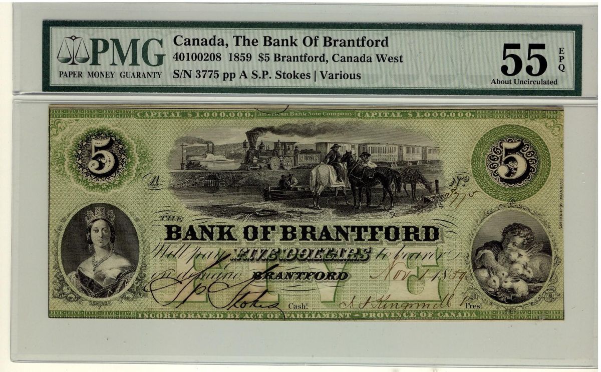 The Bank of Brantford 1859 $5 #3775, CH-40-10-02-08, PMG AU55 EPQ