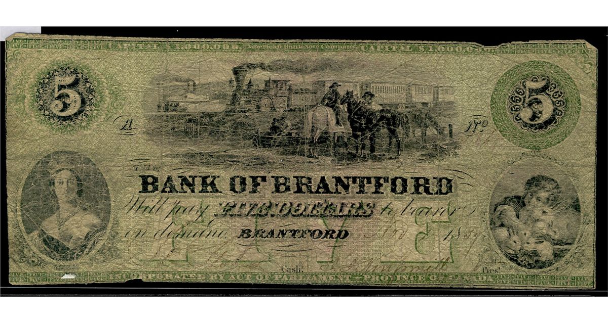The Bank of Brantford; 1859 $5 CH-40-10-04-08a. A nice F issue with Westbrook o/p.