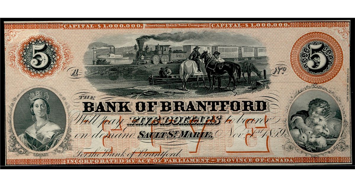 The Bank of Brantford; 1859 $5 Remainder. Nice UNC issue.