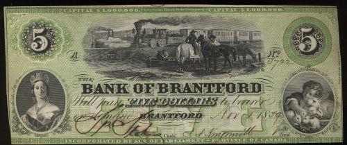 The Bank of Brantford 1859 $5 Serial # 3722 CH-40-10-04-06 Choice AU-UNC