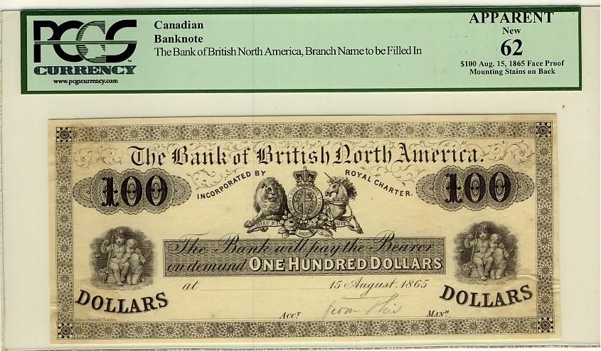 The Bank of British North America, 1865 $100 CH-55-16-24-03P, PCGS UNC62
