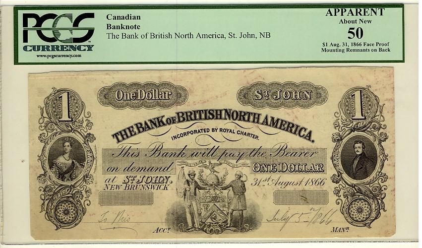 The Bank of British North America, 1866 $1 CH-55-14-14-02P, St.John's NB, PCGS AU50