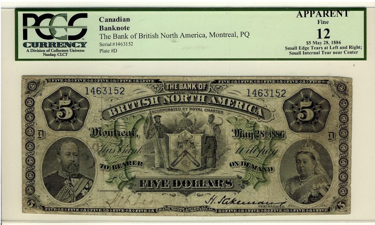 The Bank of British North America 1886 $5 #1463152 CH-55-22-04 PMG apparent F12. Sml edge tears and sml internal tear.