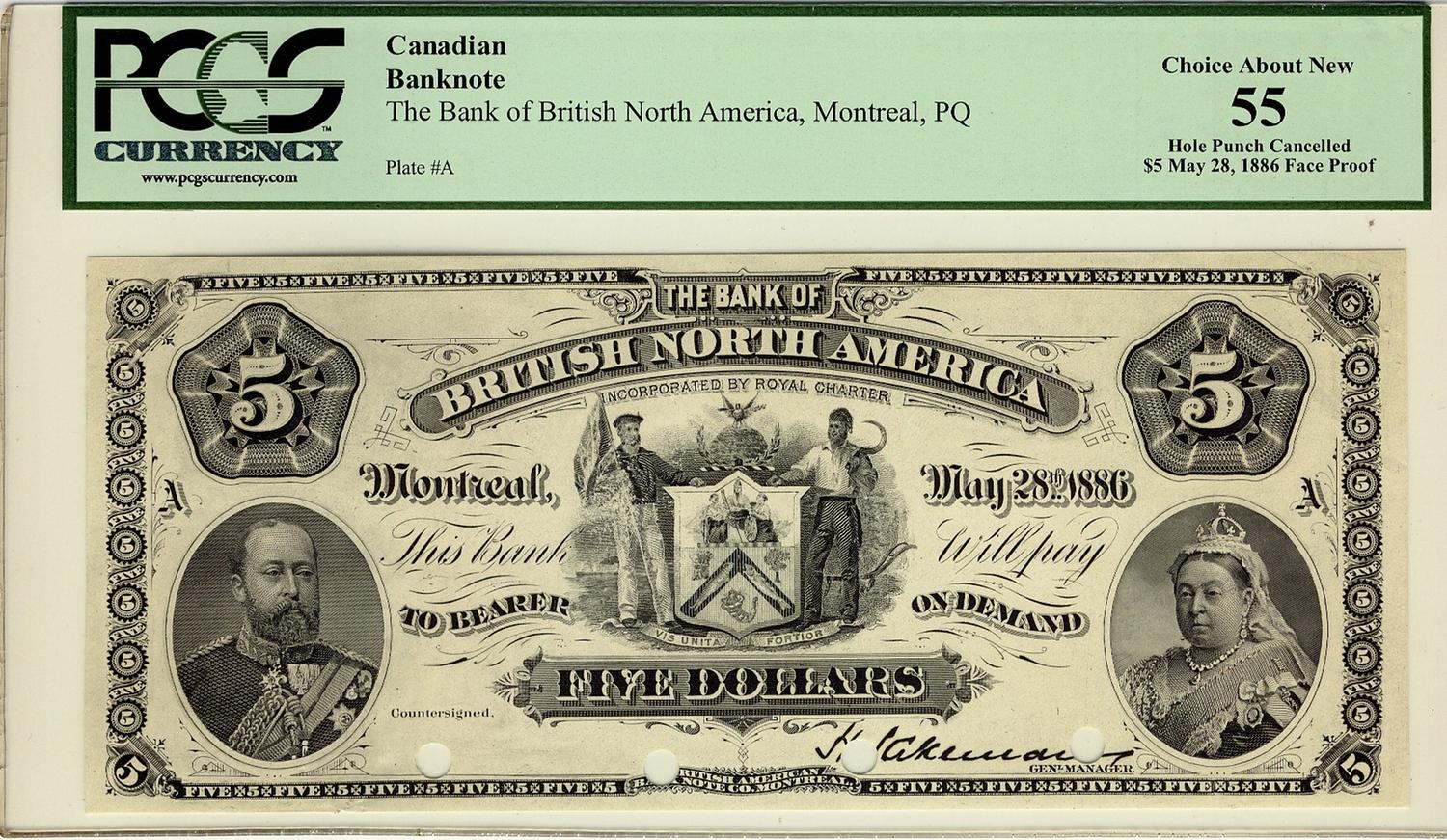 The Bank of British North America 1886 $5 Face Proof CH-55-22-02P. PCGS AU55.