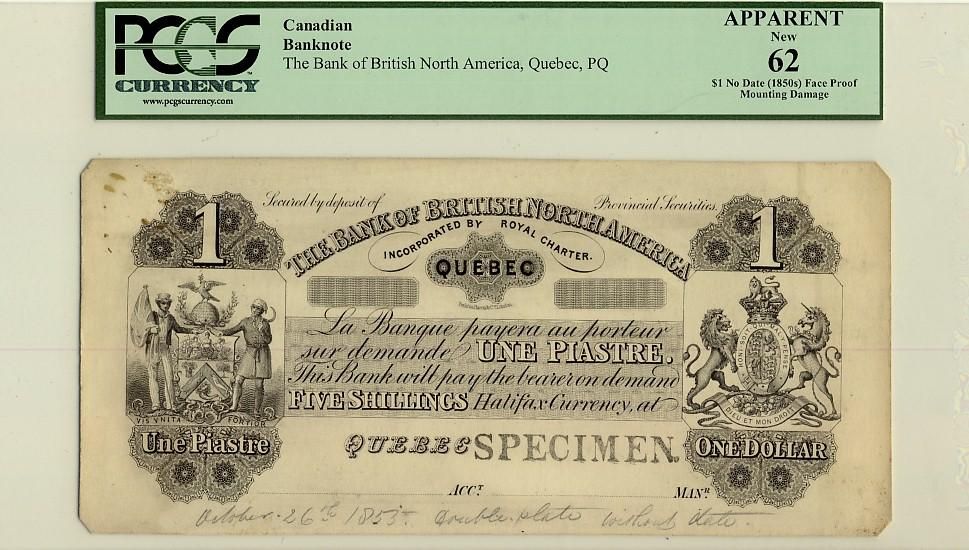 The Bank of British North America, Large size note, Specimen, 1850's $1 (5 shillings), PCGS UNC62