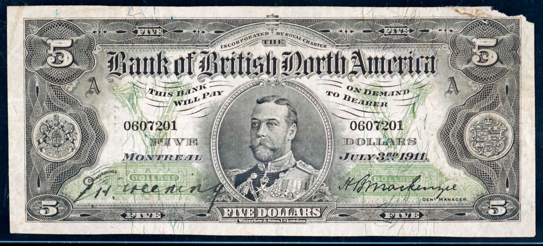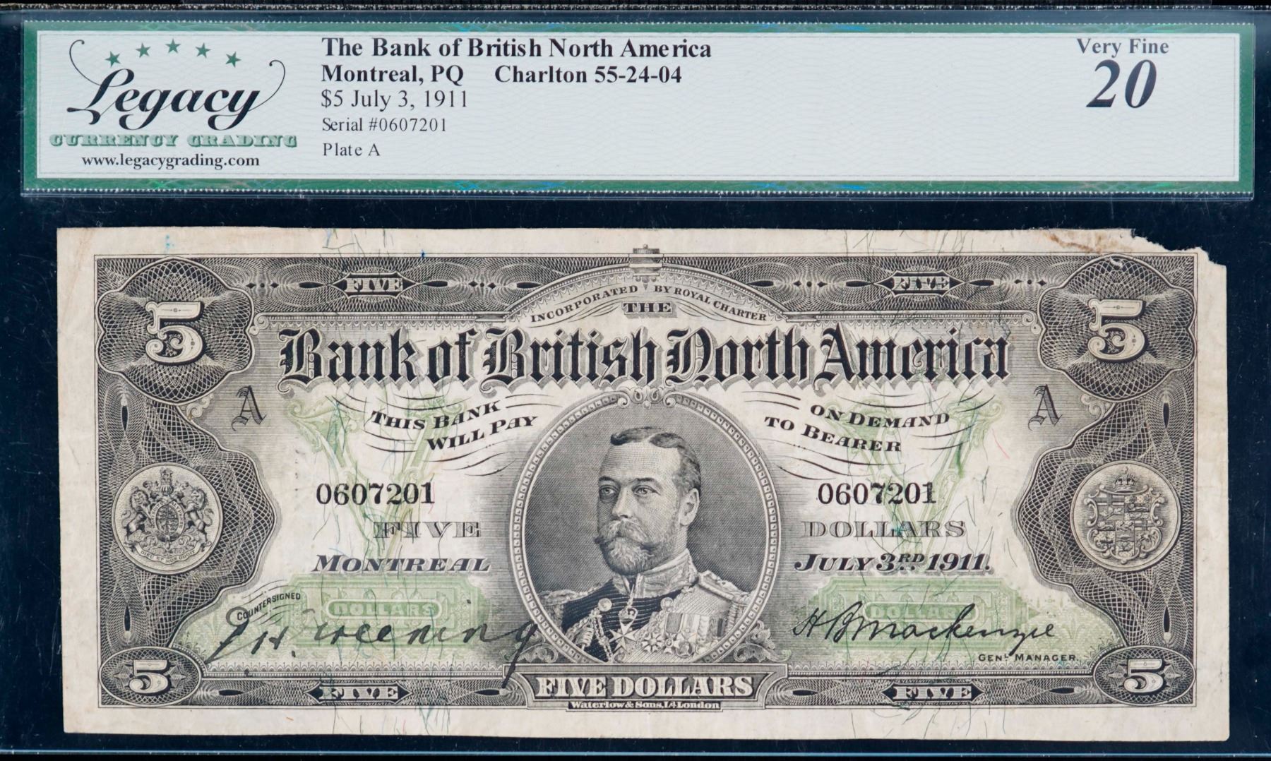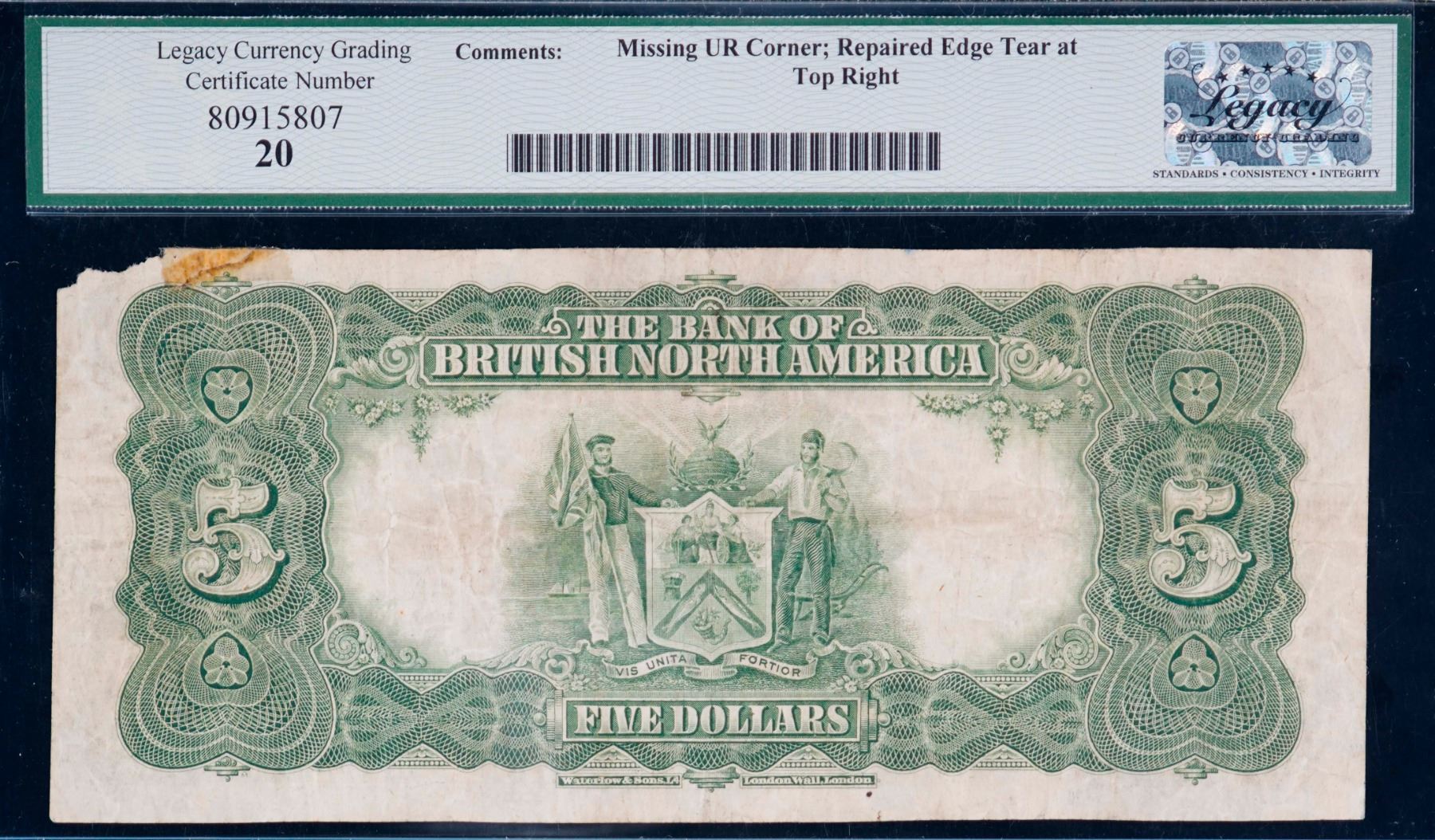 The Bank of British of North America 1911 $5 #0607201 CH-55-24-04 Legacy Very Fine-20 Missing UR corner.