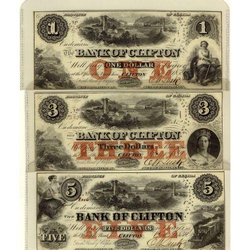 The Bank of Clifton 1859 $1, $3, $5, CH-10-04-02, CH-10-04-04 and CH-10-04-06. Fully engraved with one signature. All UNC.