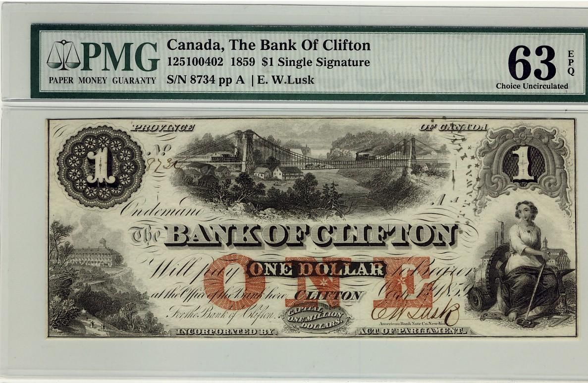 The Bank of Clifton 1859 $1 #8734 CH-125-10-04-02, PMG CH UNC63 EPQ.