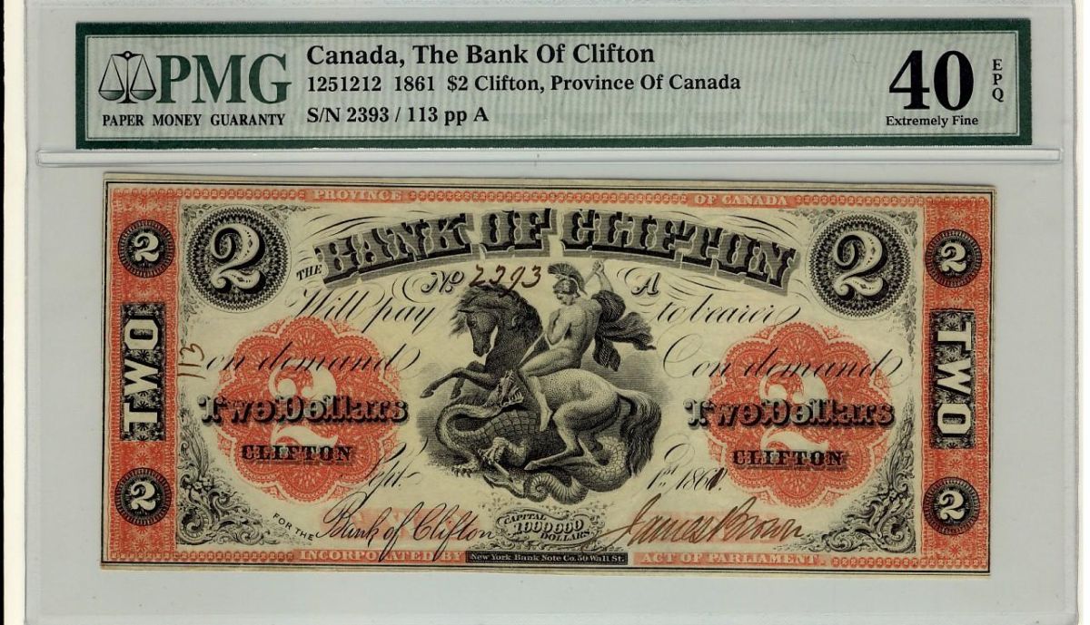 The Bank of Clifton, 1859 $2 CH-125-12-10. PMG EF40 EPQ.