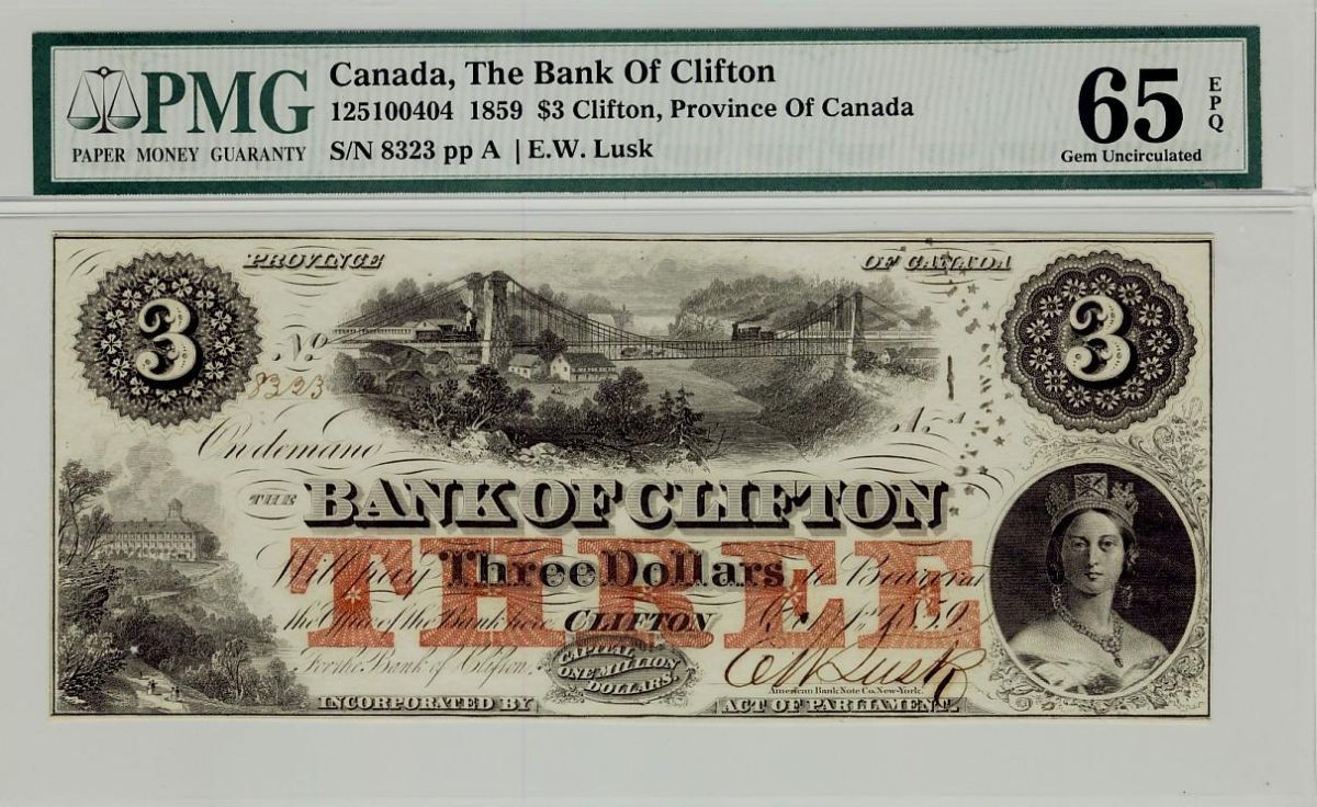 The Bank of Clifton 1859 $3 #8223 CH-125-10-04-04, PMG Gem UNC65 EPQ.