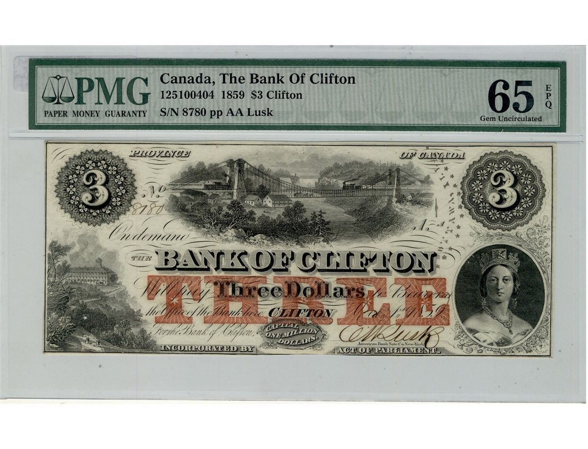 The Bank of Clifton; 1859 $3 #8780 CH-125-10-04-04 PMG Gem UNC65EPQ.