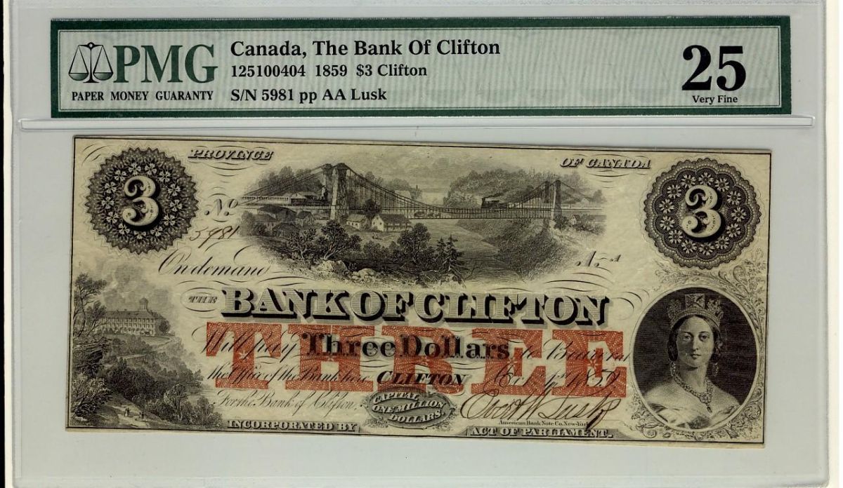 The Bank of Clifton, 1859 $3 CH-125-10-04-04. PMG VF25.