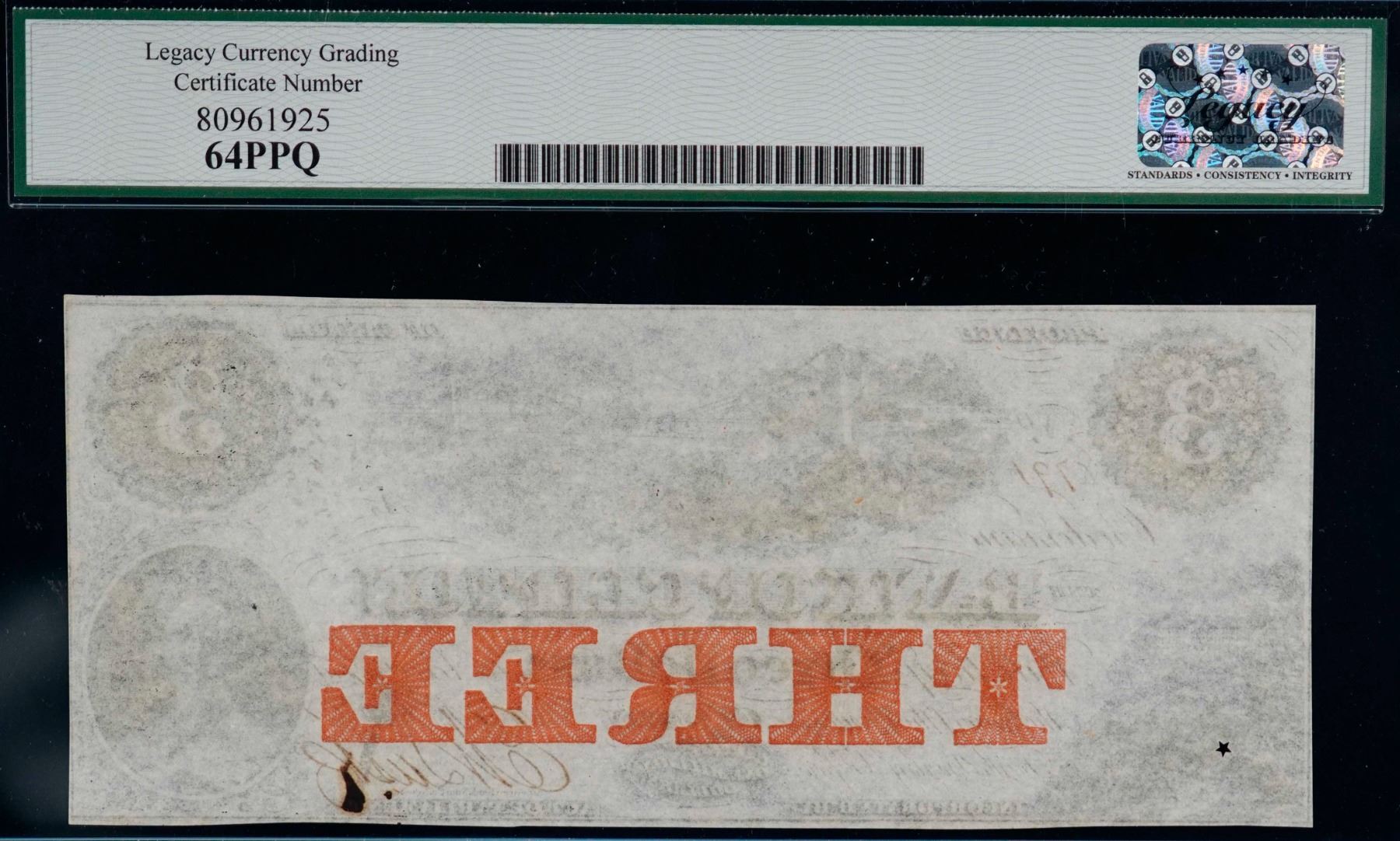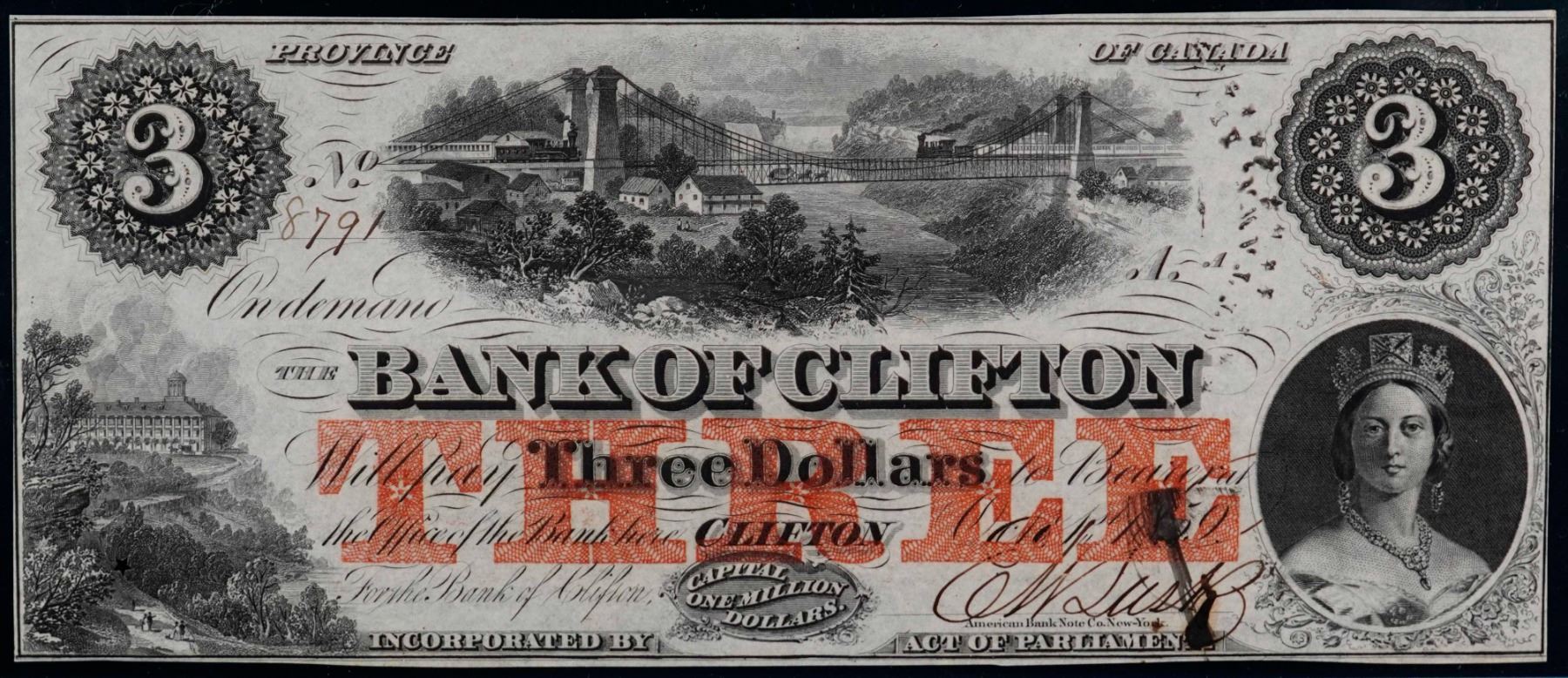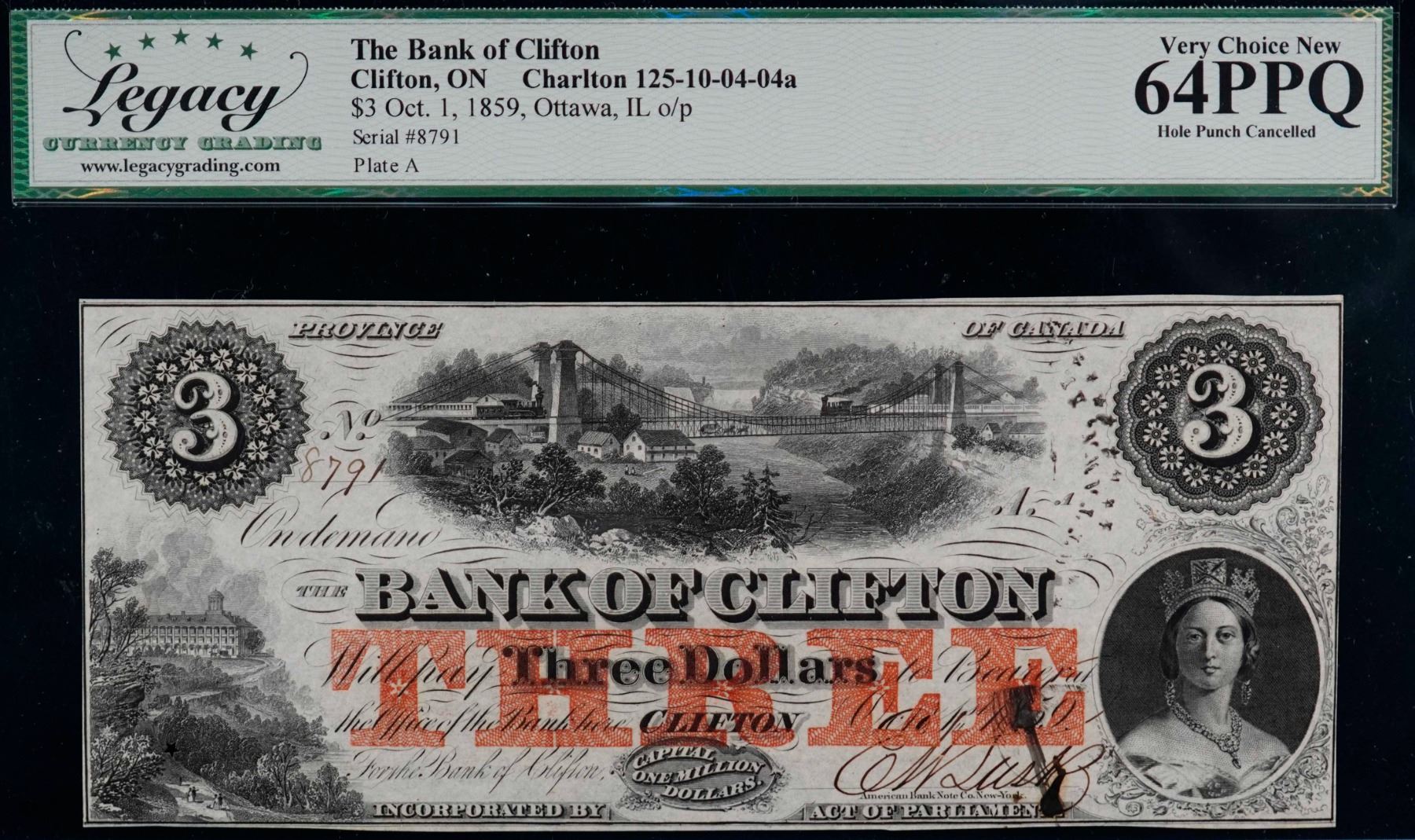 The Bank of Clifton 1859 $3 CH-125-10-04-04a #8791 LCG Choice Uncirculated-64PPQ