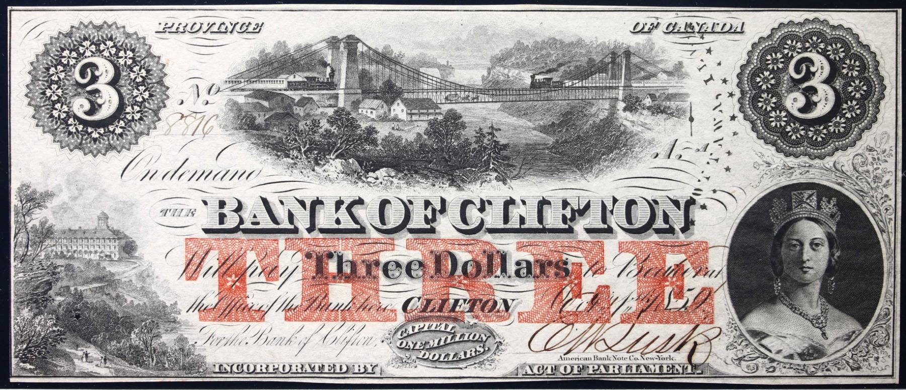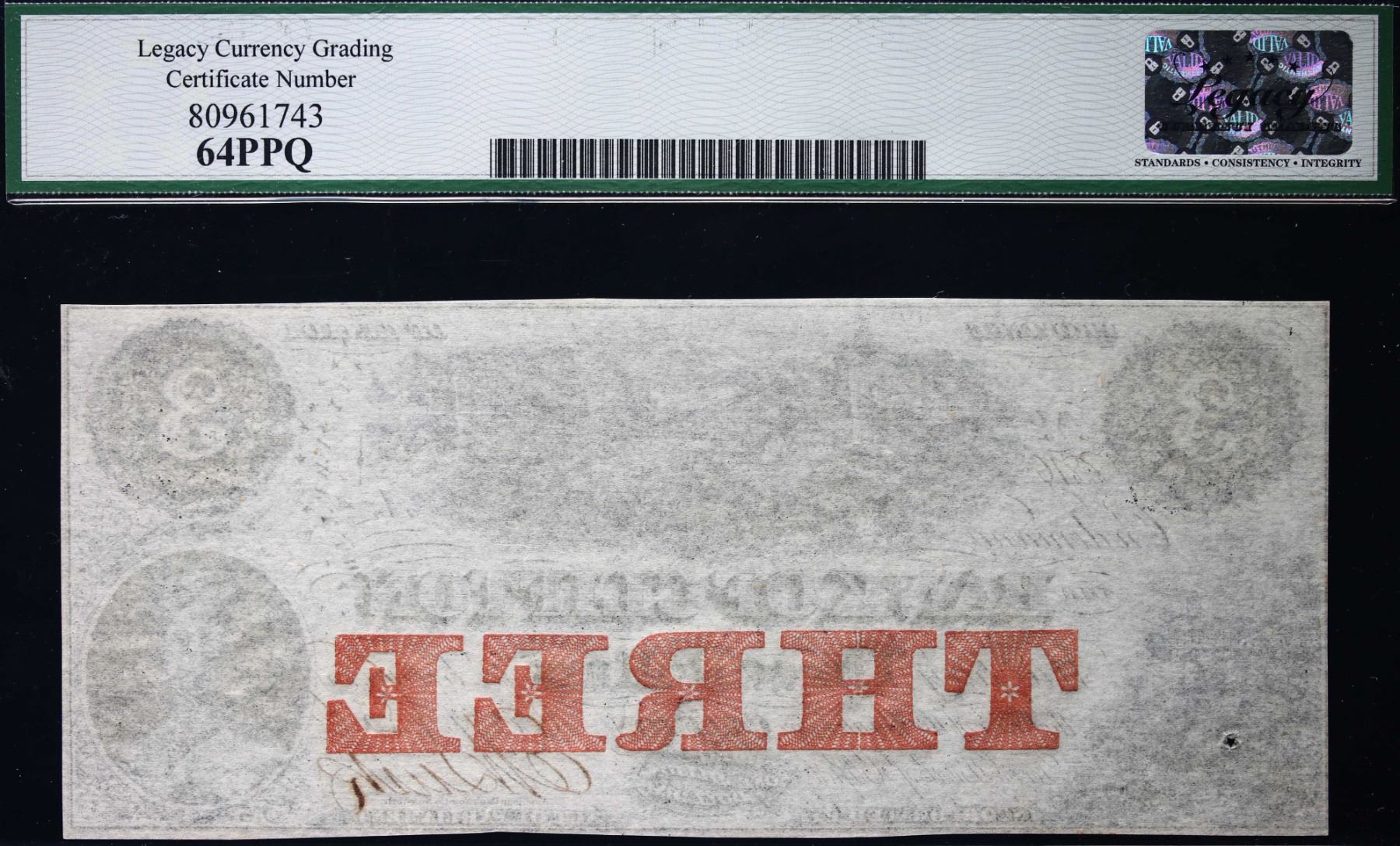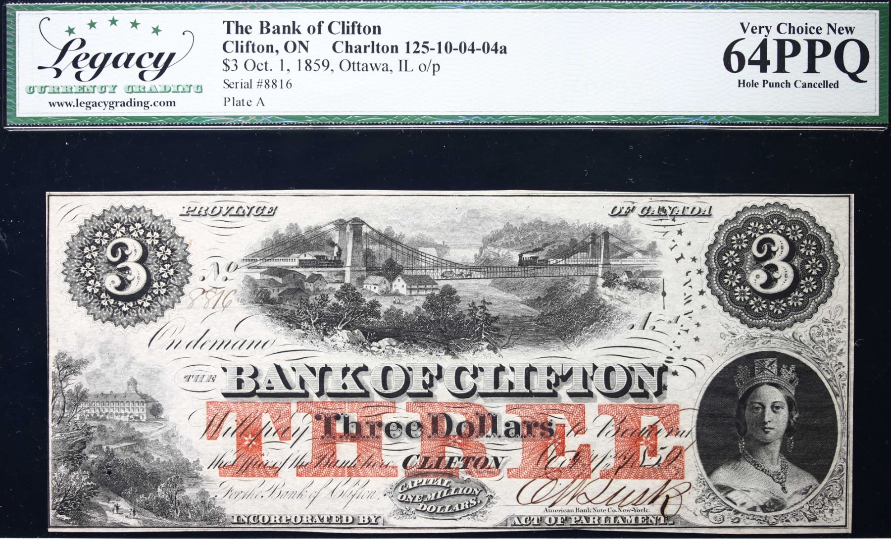 The Bank of Clifton 1859 $3 CH-125-10-04-04a #8816 LCG Choice Uncirculated-64 PPQ