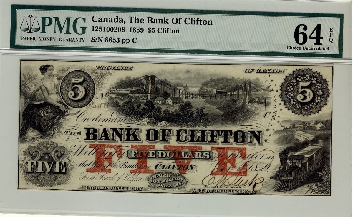 The Bank of Clifton 1859 $5 #8653 CH-125-10-02-06, PMG CH UNC64 EPQ.