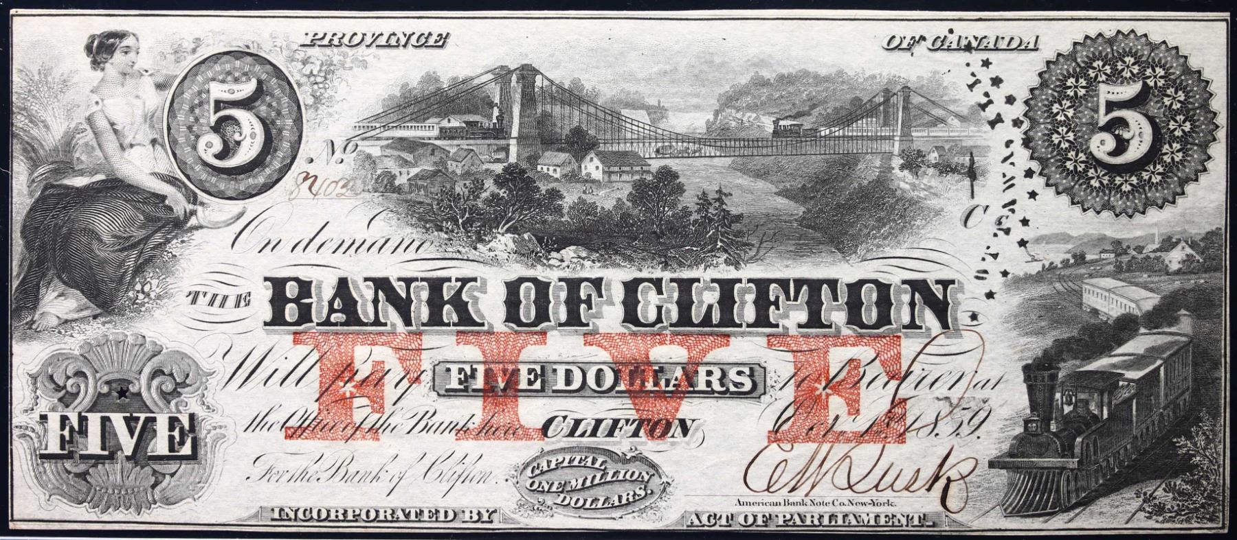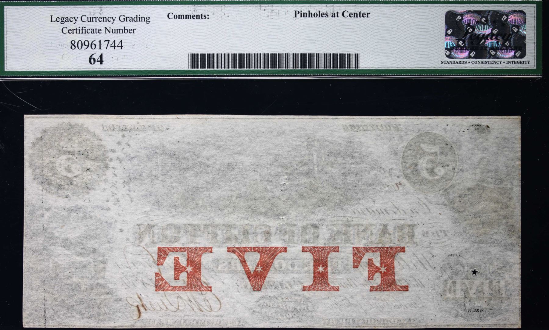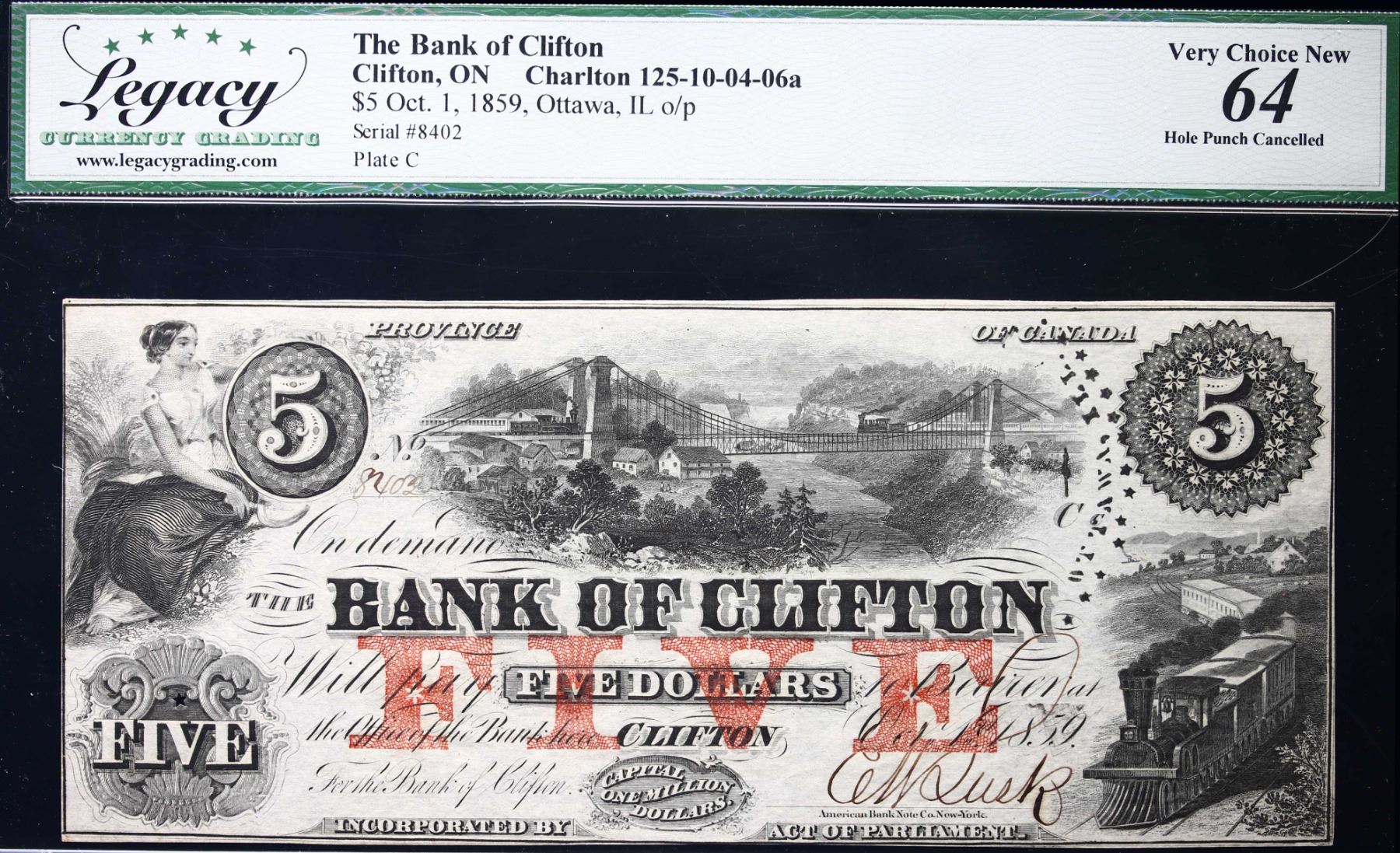 The Bank of Clifton 1859 $5 CH-125-10-04-06A #8402 LCG Choice Uncirculated-64, pinholes