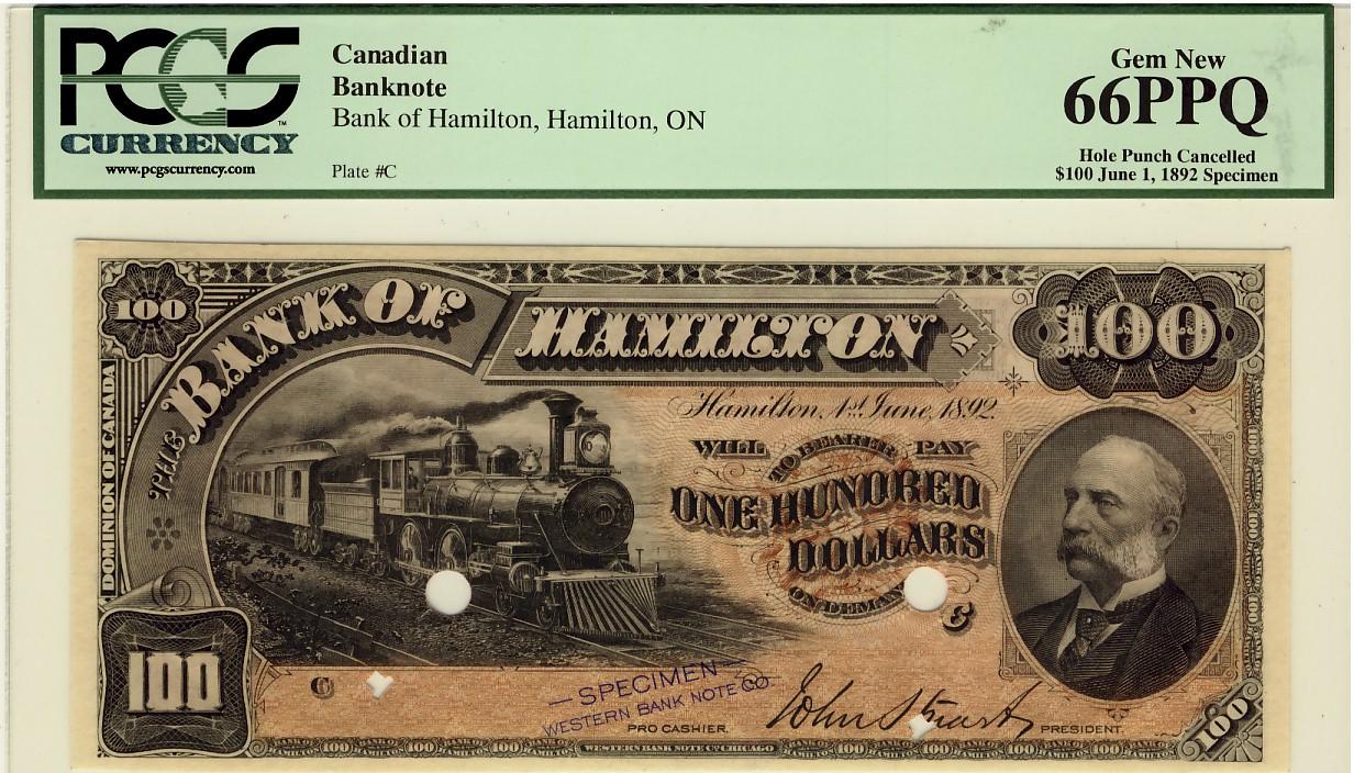 The Bank of Hamilton 1892 $100 CH-345-16-02aS PCGS UNC66PPQ
