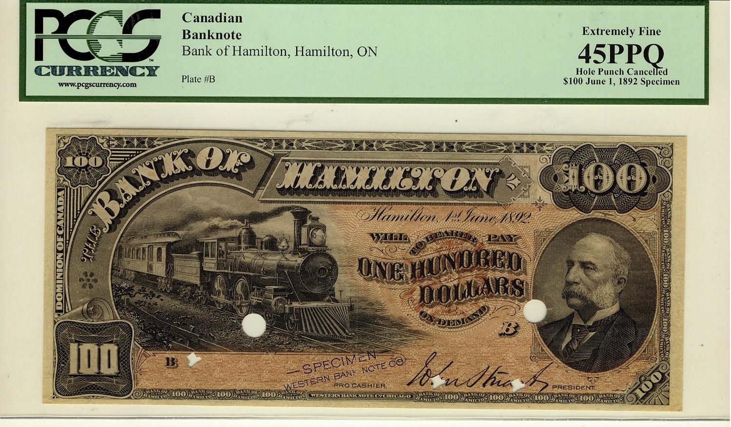 The Bank of Hamilton, 1892 $100 CH-345-16-10S Specimen Issue, PCGS EF45PPQ. Wow' So attractive.