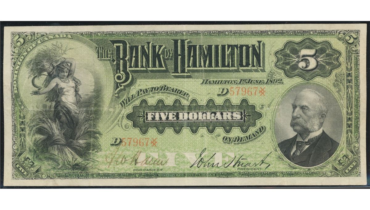 The Bank of Hamilton 1892 $5 #57967, CH-345-16-02a, nice VF-30.