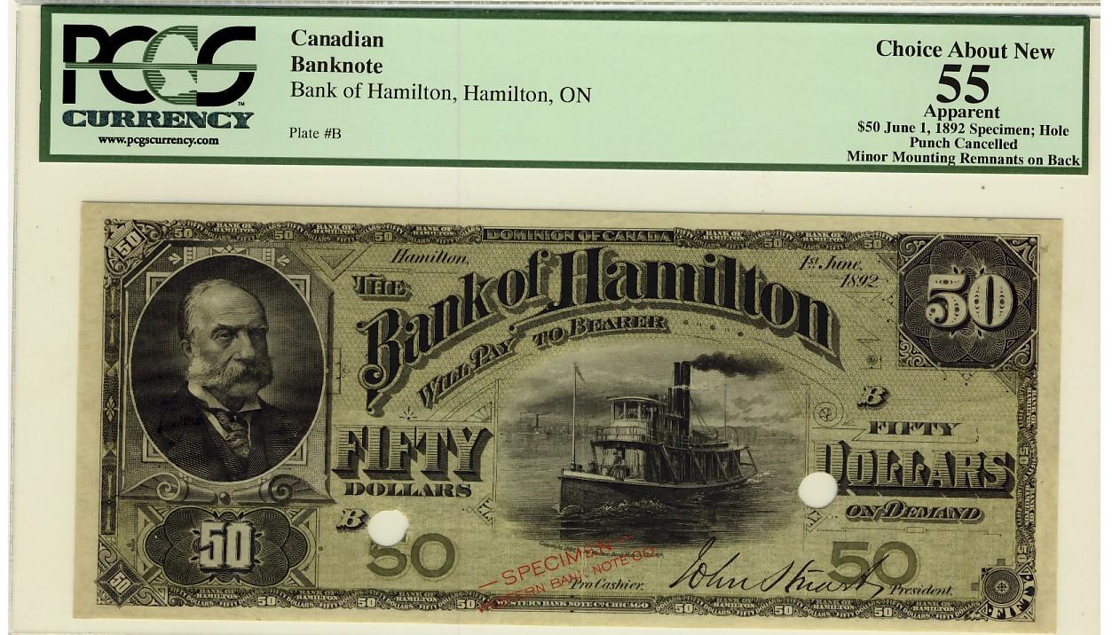 The Bank of Hamilton 1892 $50 CH345-16-08S PCGS AU55