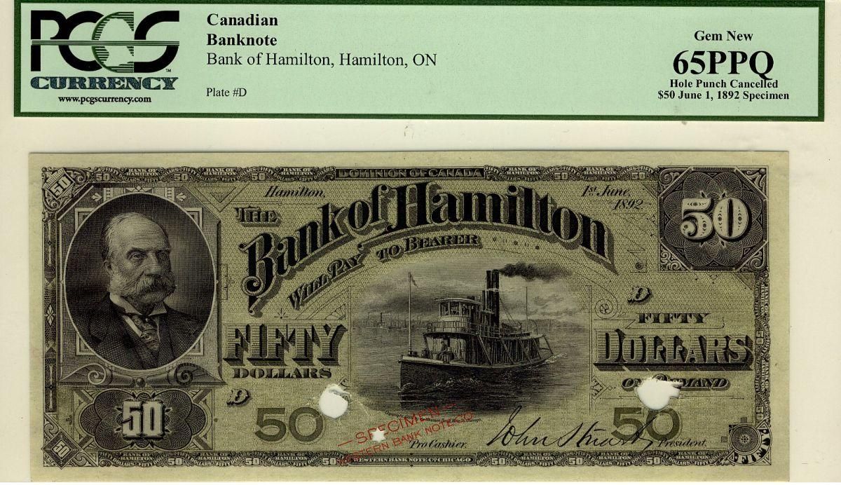 The Bank of Hamilton, 1892 $50 SP, CH-345-16-08S, PCGS Unc 65 PPQ