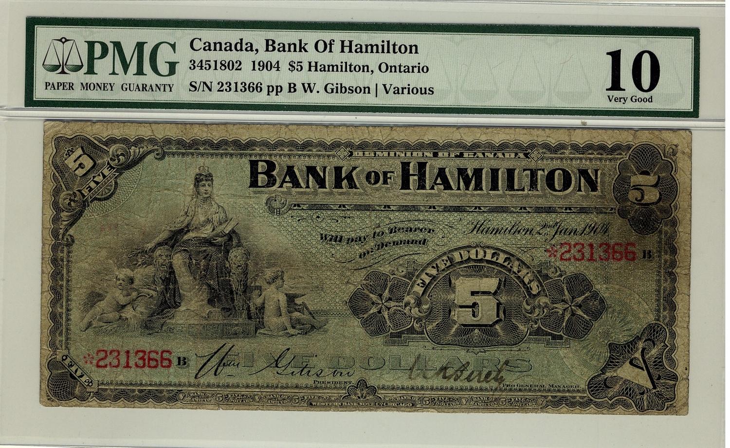 The Bank of Hamilton, 1904 $5 #231366, CH-345-18-02, PMG VG10. Pop: 16 examples known.