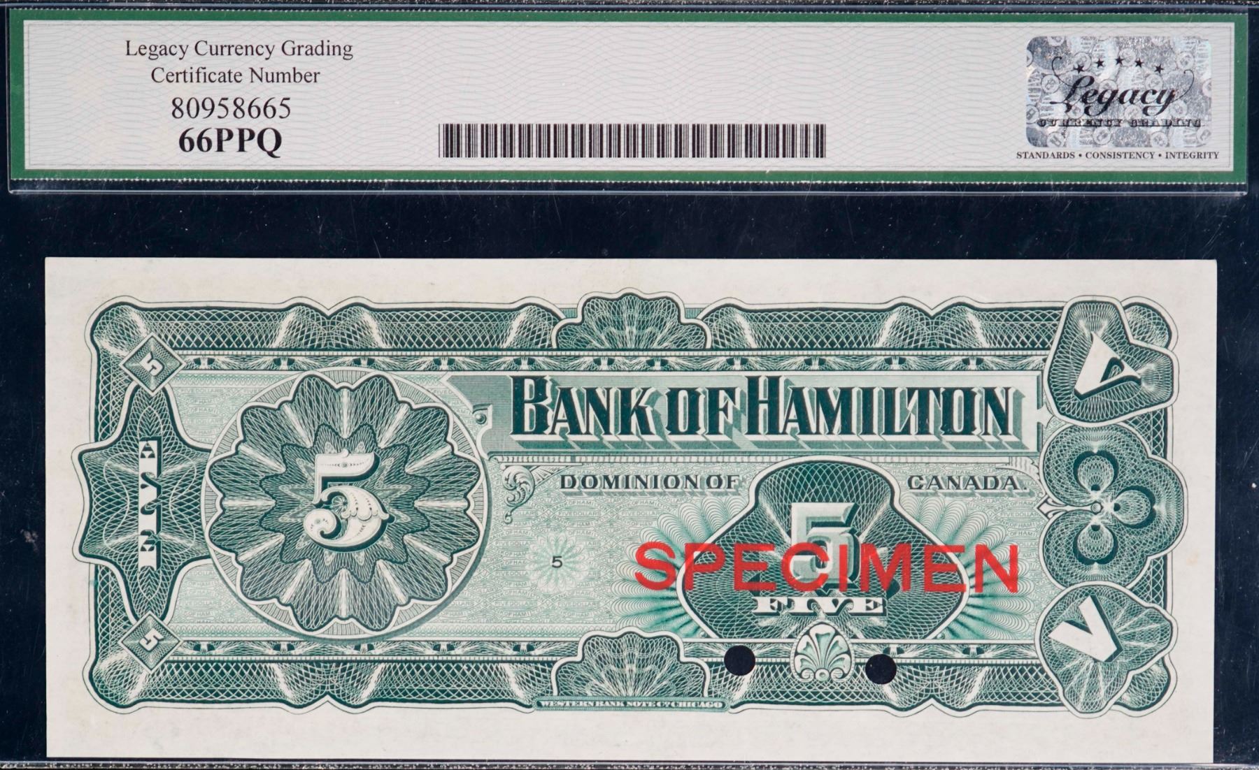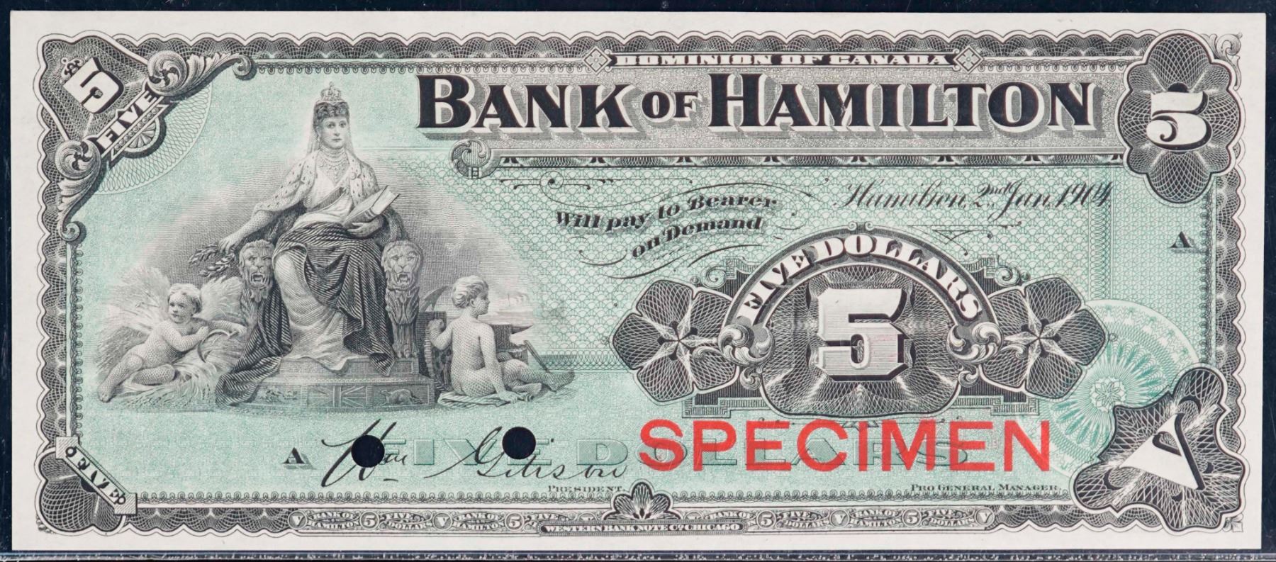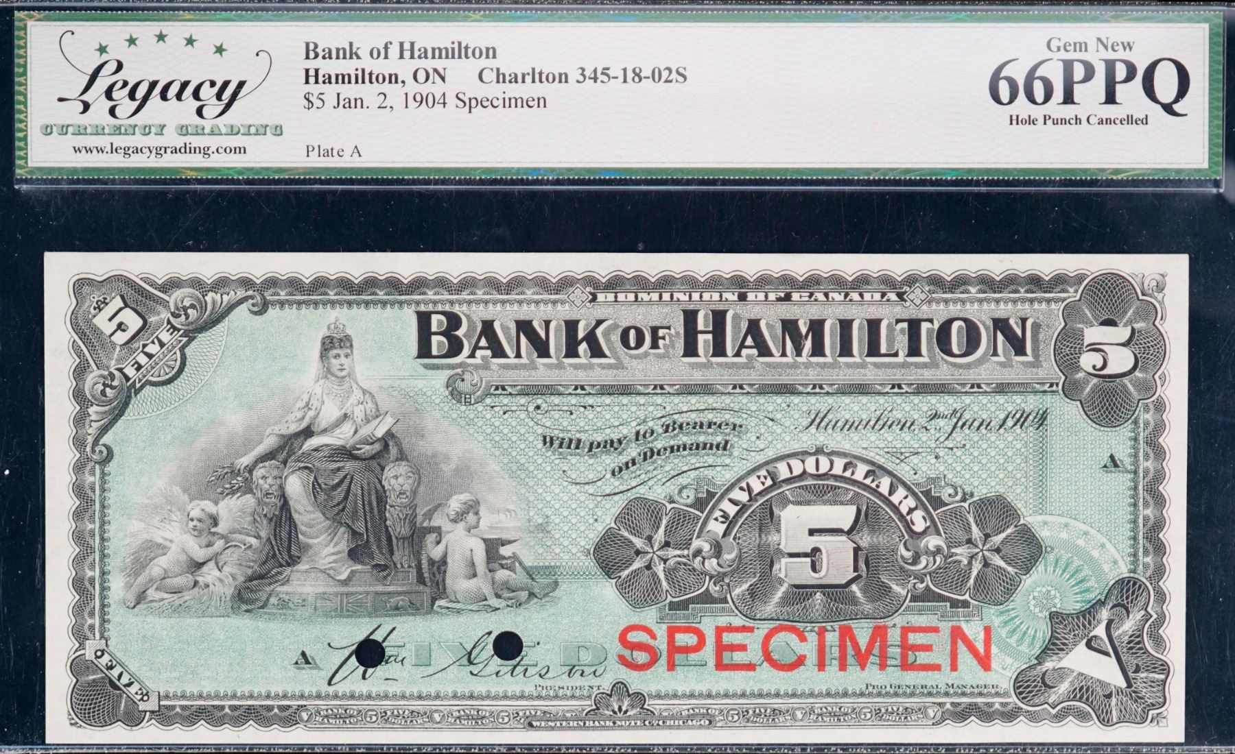 The Bank of Hamilton; 1904 $5 CH-345-18-02S, Legacy Gem Superb Gem Uncirculated-66PPQ. Hole Punch Cancelled.