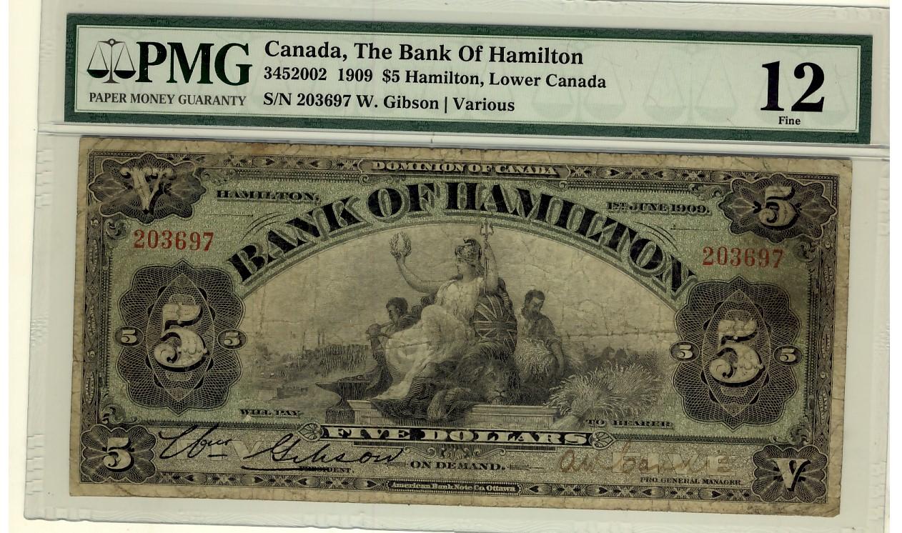 The Bank of Hamilton 1909 $5 203697 CH-345-20-02 PMG F12