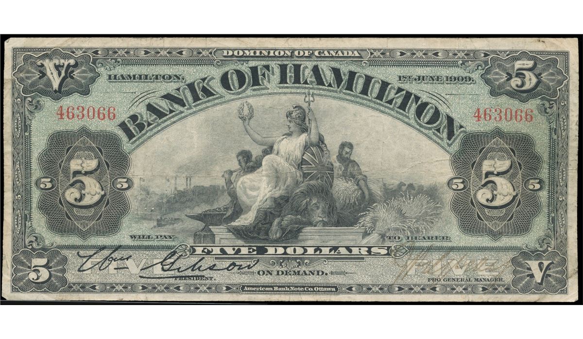 The Bank of Hamilton 1909 $5 #463066, CH-345-20-02, Nice F-VF.