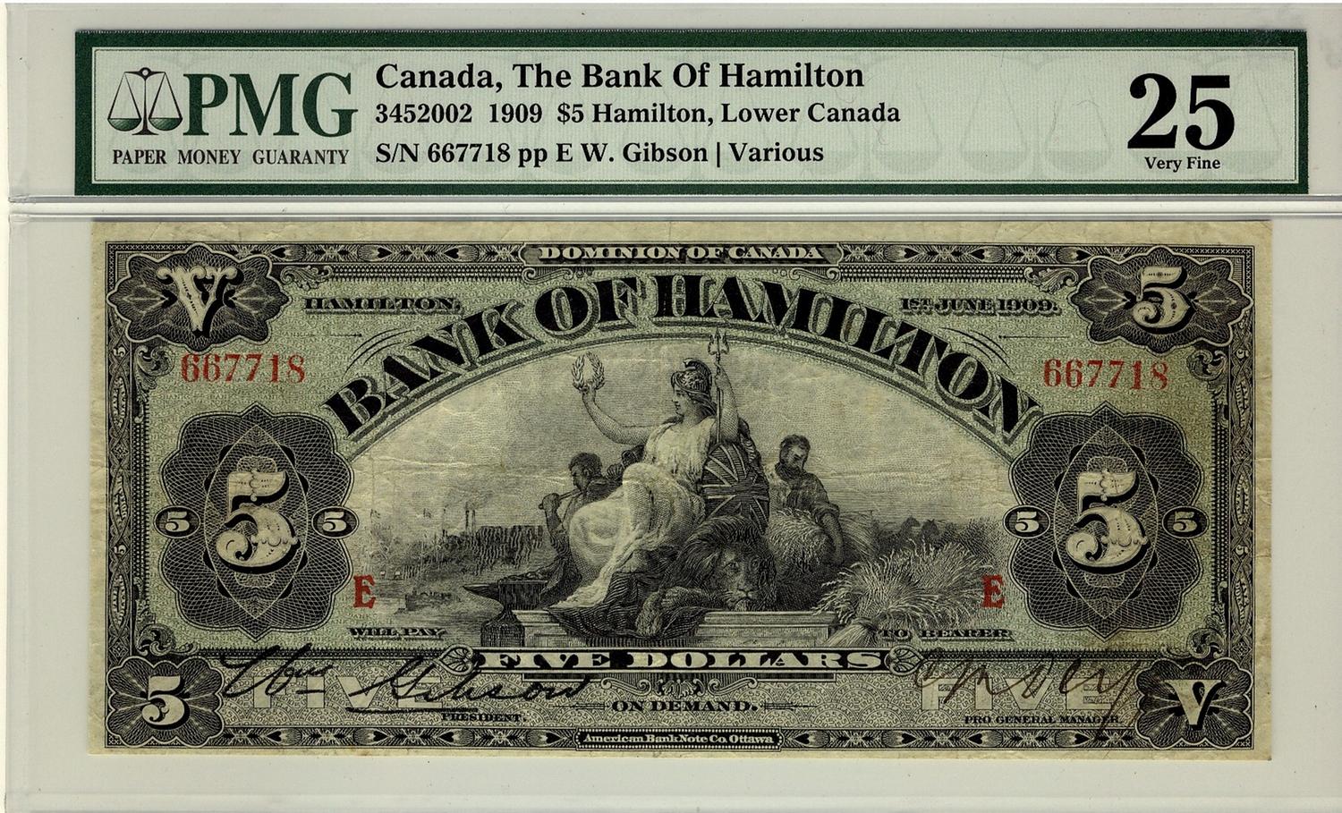 The Bank of Hamilton, 1909 $5 #667718, CH-345-20-02, PMG VF25.
