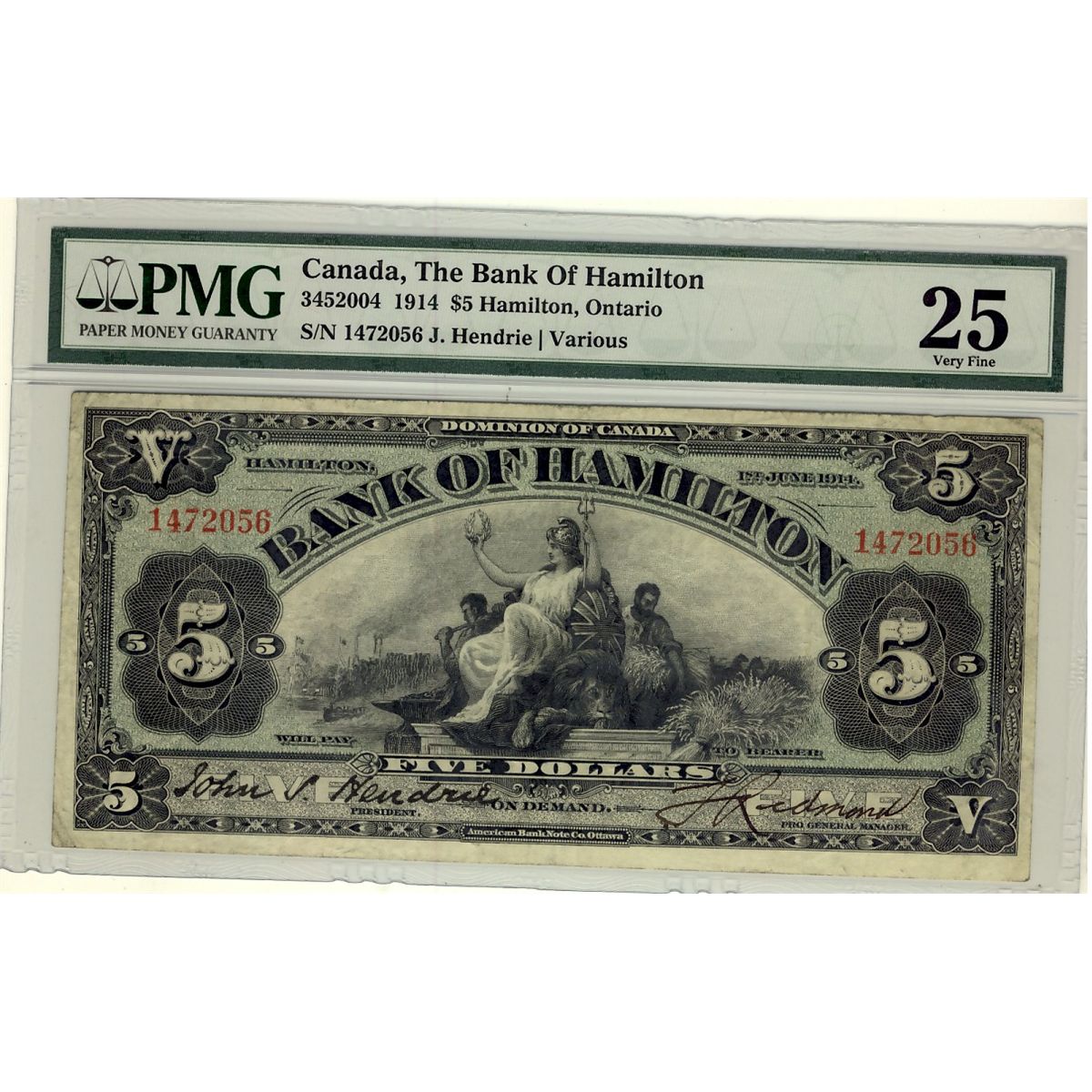 The Bank of Hamilton 1914 $5 #1472056 CH-345-20-04 PMG VF25, best example graded by PMG.