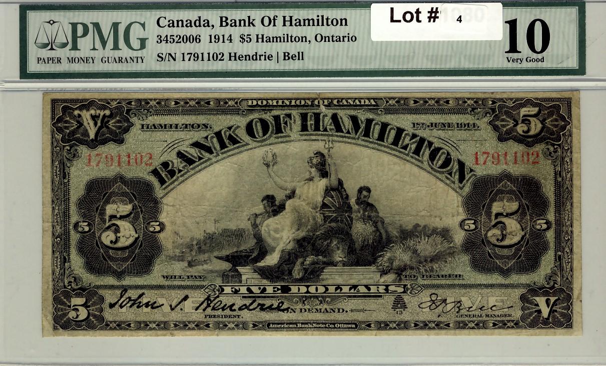 The Bank of Hamilton 1914 $5 #1791102, CH345-20-06 PMG VG10.