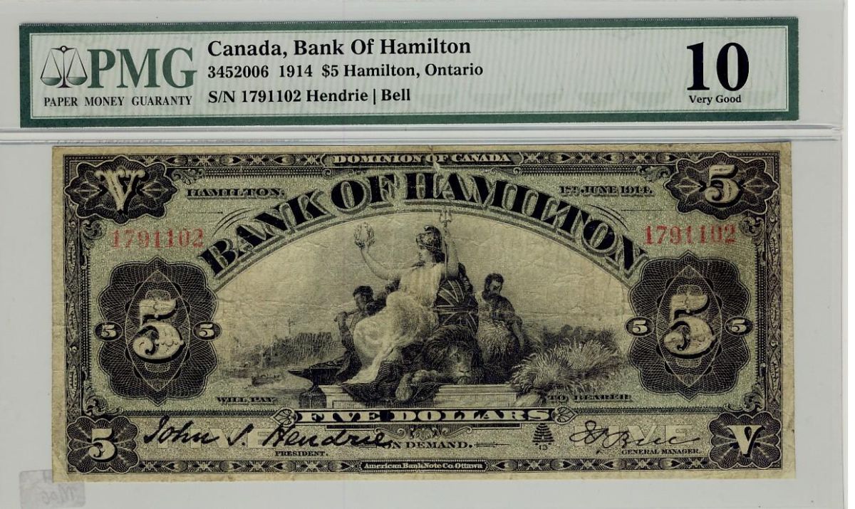 The Bank of Hamilton 1914 $5 #1791102, CH345-20-06 PMG VG10.