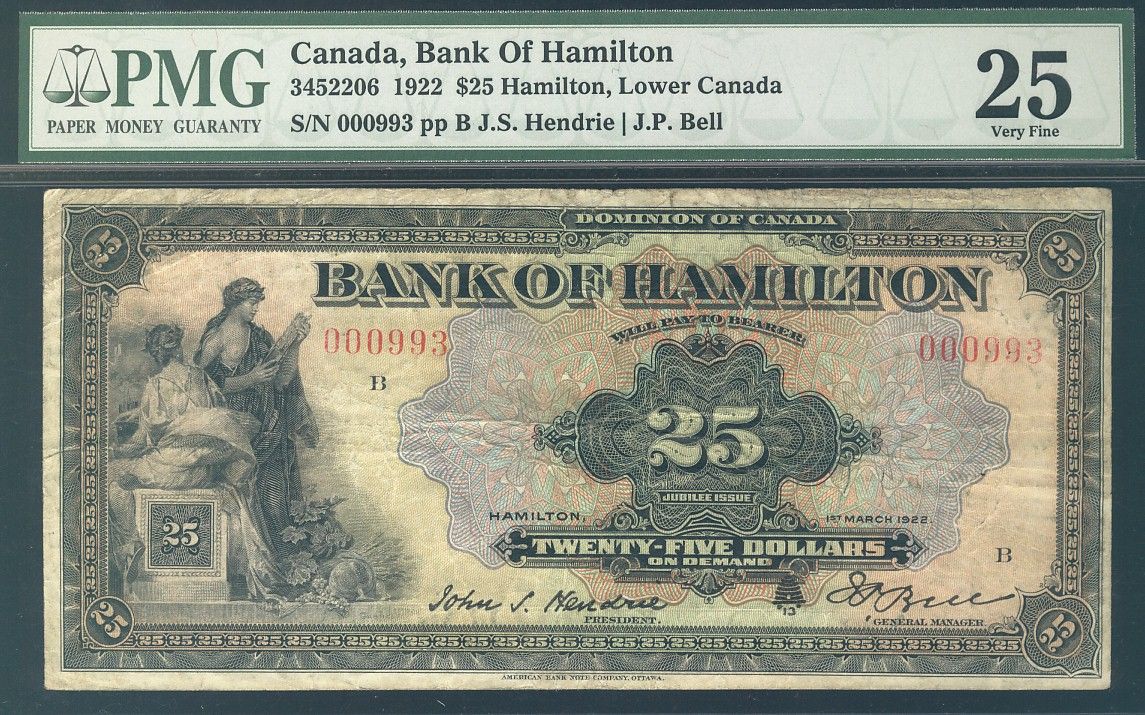 The Bank of Hamilton, 1922 $25 CH-345-22-06 PMG VF25, a solid example with great colours. Very rare, attractive and desirable. This example was sold at auction in 2008 for $20K.