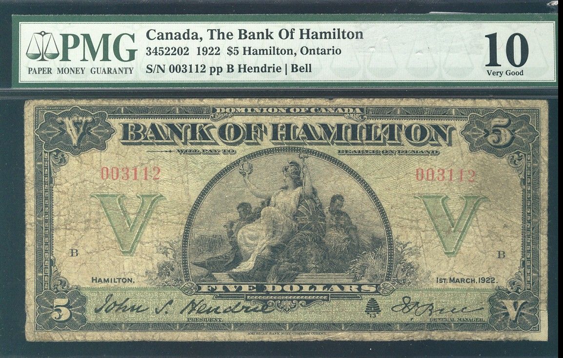 The Bank of Hamilton, 1922 $5 #003112, CH-345-22-02, PMG VG10. Only 9 examples known. Rare issue.