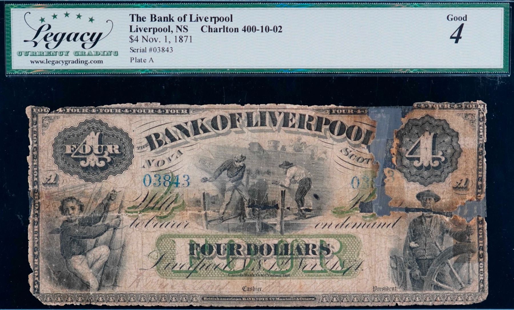 The Bank of Liverpool 1871 $4 400-10-02 #03843 LCG Good-4, with issues. Rarely offered.