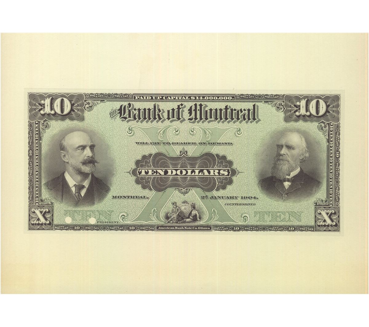 The Bank of Montreal; $10.00. Jan. 2, 1904. CH-505-48-04P. A Full Colour Face Proof on thin paper on original card, as made. An unlisted variety, with full green pantograph tint of ‘Bank of Montreal/10’ in white areas of the accepted design. The Ten-Ten counters in the signature area have a pantograph of TEN TEN. A pristine Proof.