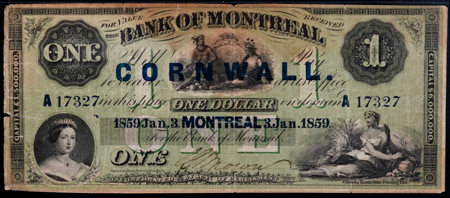The Bank of Montreal; 1859 $1 #A17327 W/Large "overprint CORNWALL", CH-505-30-02-02 An exceedingly scarce note in Fine or better for grade. Good appeal for the assigned grade. A few edge nicks.