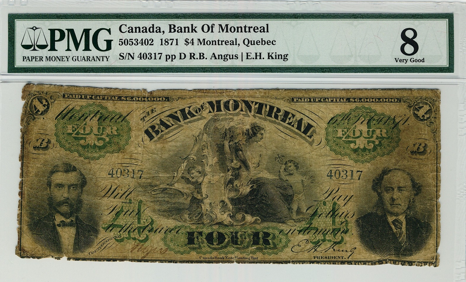 The Bank of Montreal 1871 $4 40317 CH-505-34-02 PMG VG8