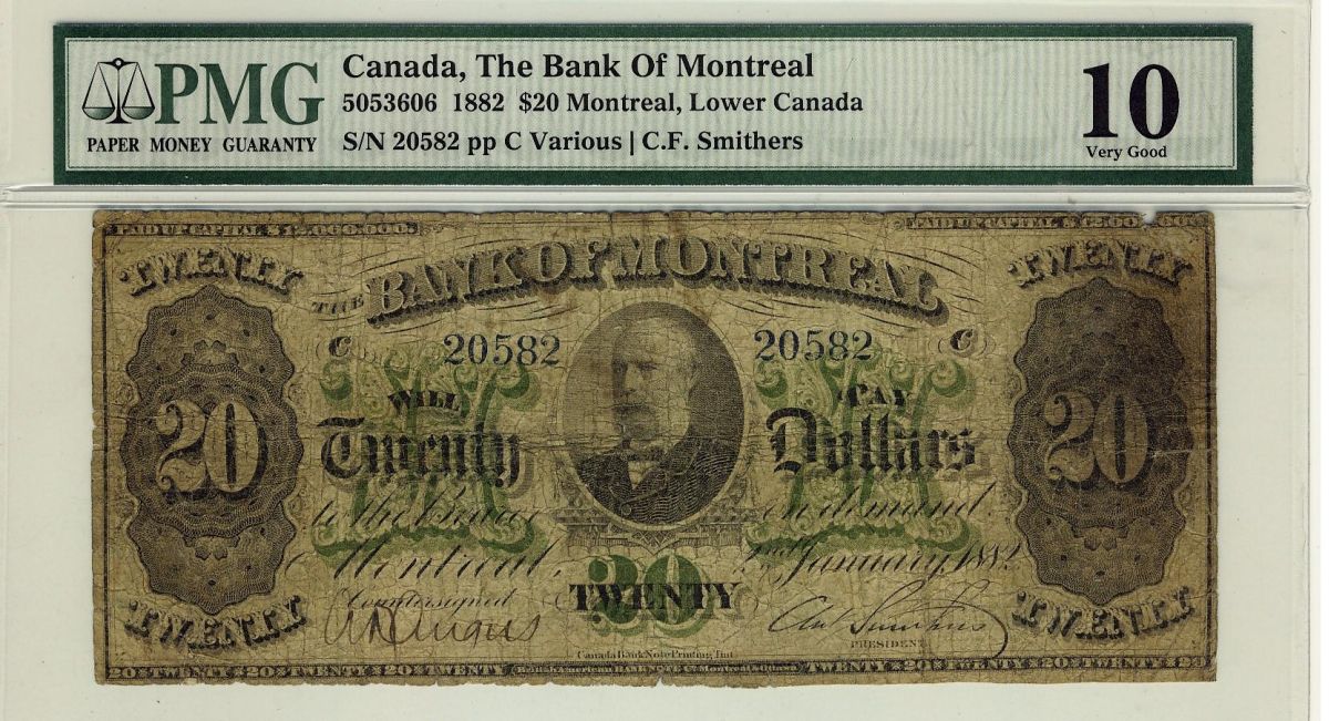 The Bank of Montreal, 1882 $20 #20582, CH-505-36-06, PMG VG10. The only example graded by PMG. Very scarce.