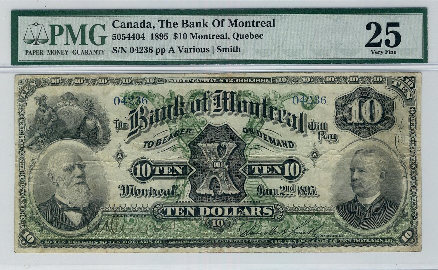 The Bank of Montreal 1895 $10 04236 CH-505-44-04 PMG VF25