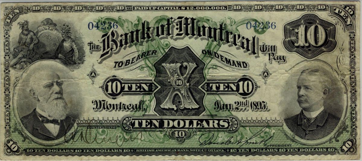 The Bank of Montreal 1895 $10 #04236 CH-505-44-04 PMG VF25. Extremely Rare in this condition. Not indicated on holder, note shows a very minor splice, most likely repaired in the past.