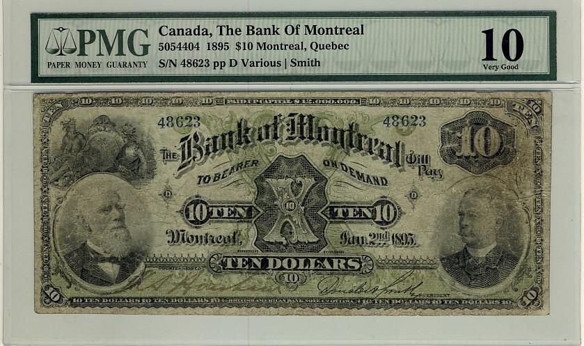 The Bank of Montreal, 1895 $10 #48623, CH-505-44-04, PMG VG10. Scarce.