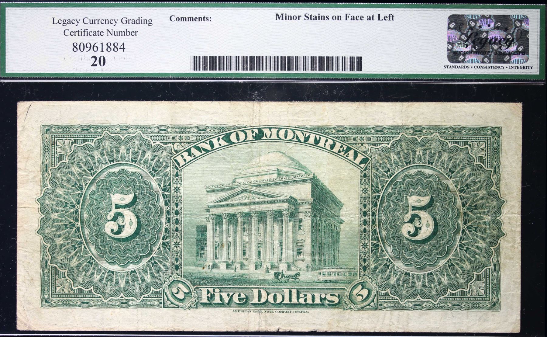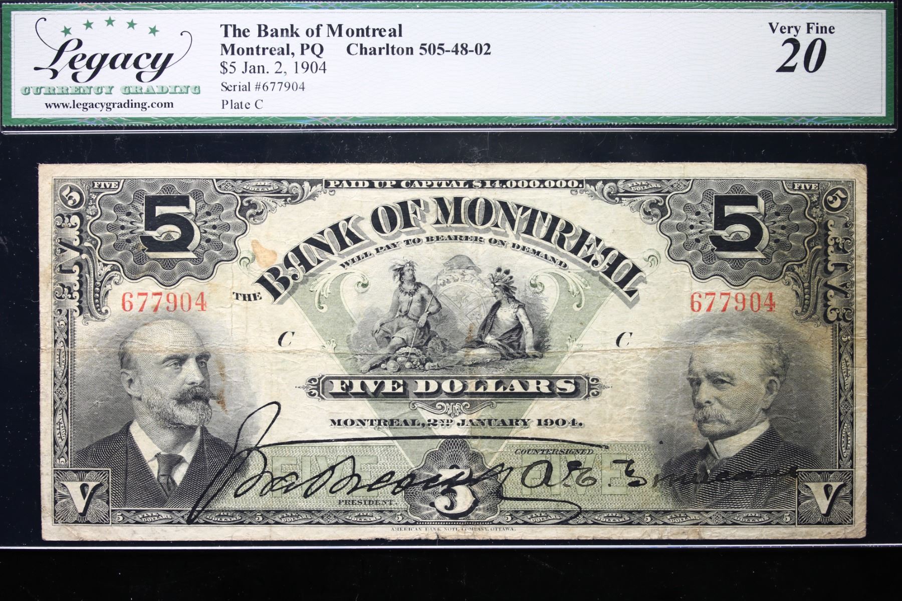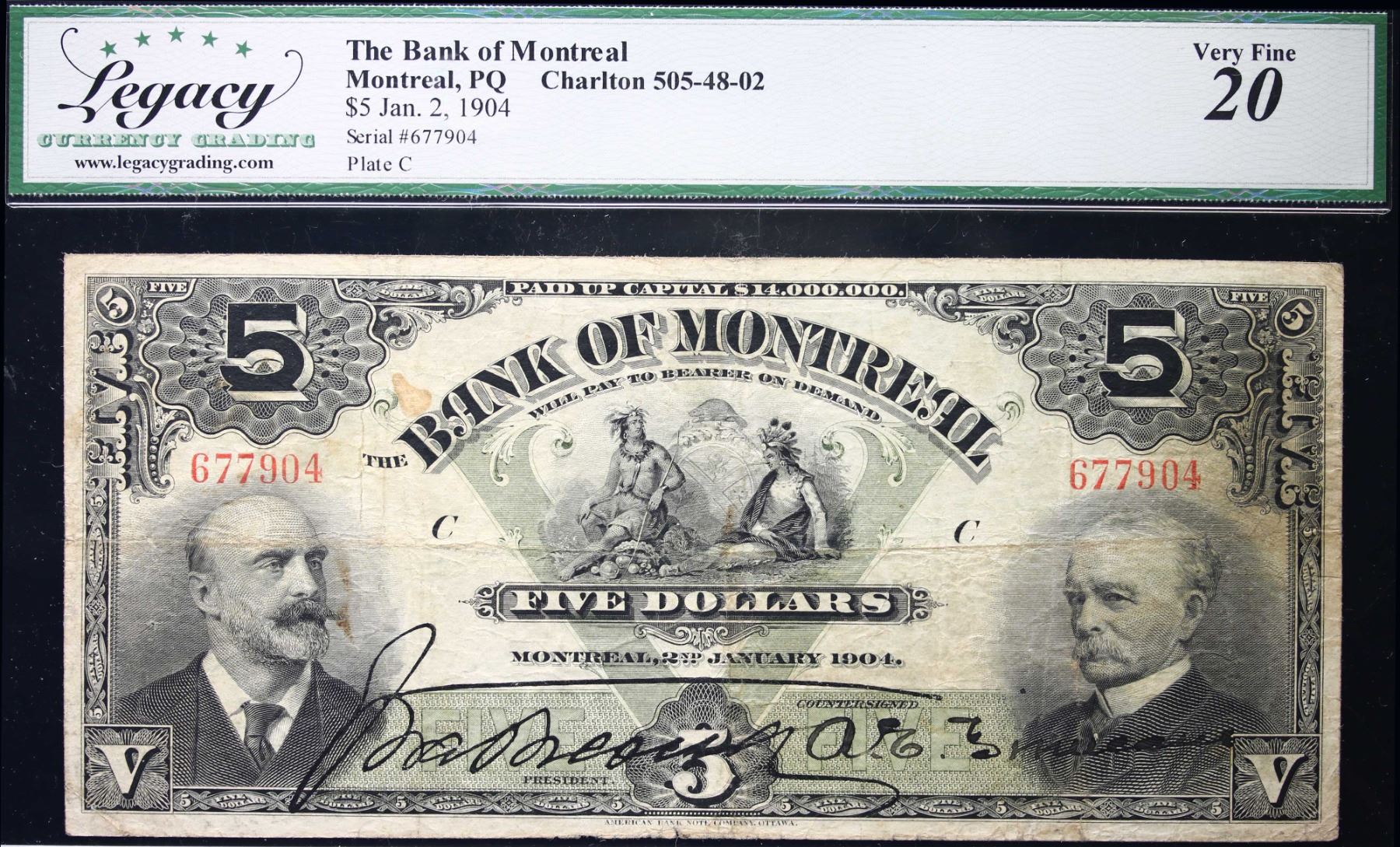 The Bank of Montreal 1904 $5 CH-505-48-02 #677904 LCG Very Fine-20, minor stains.