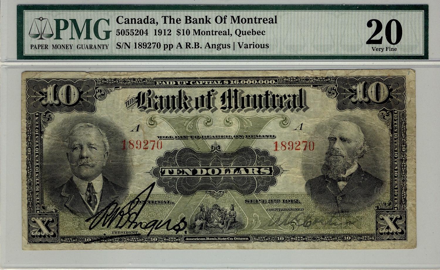 The Bank of Montreal, 1912 $10 #189270, CH-505-52-04, PMG VF20. Only 12 known.