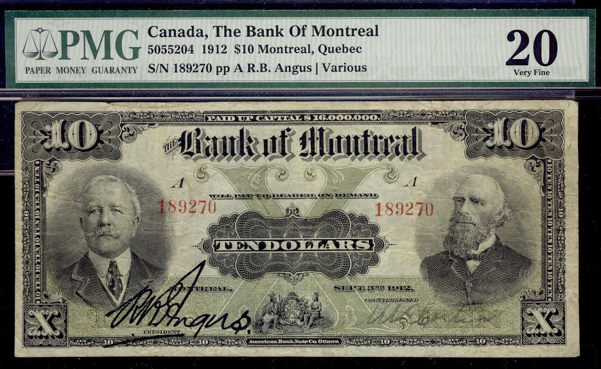 The Bank of Montreal 1912 $10 #189270 CH-505-52-04 PMG VF20. Rare this nice.
