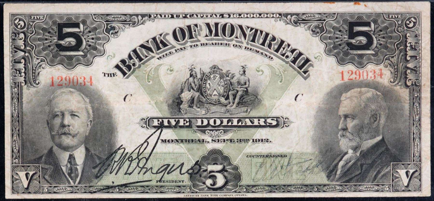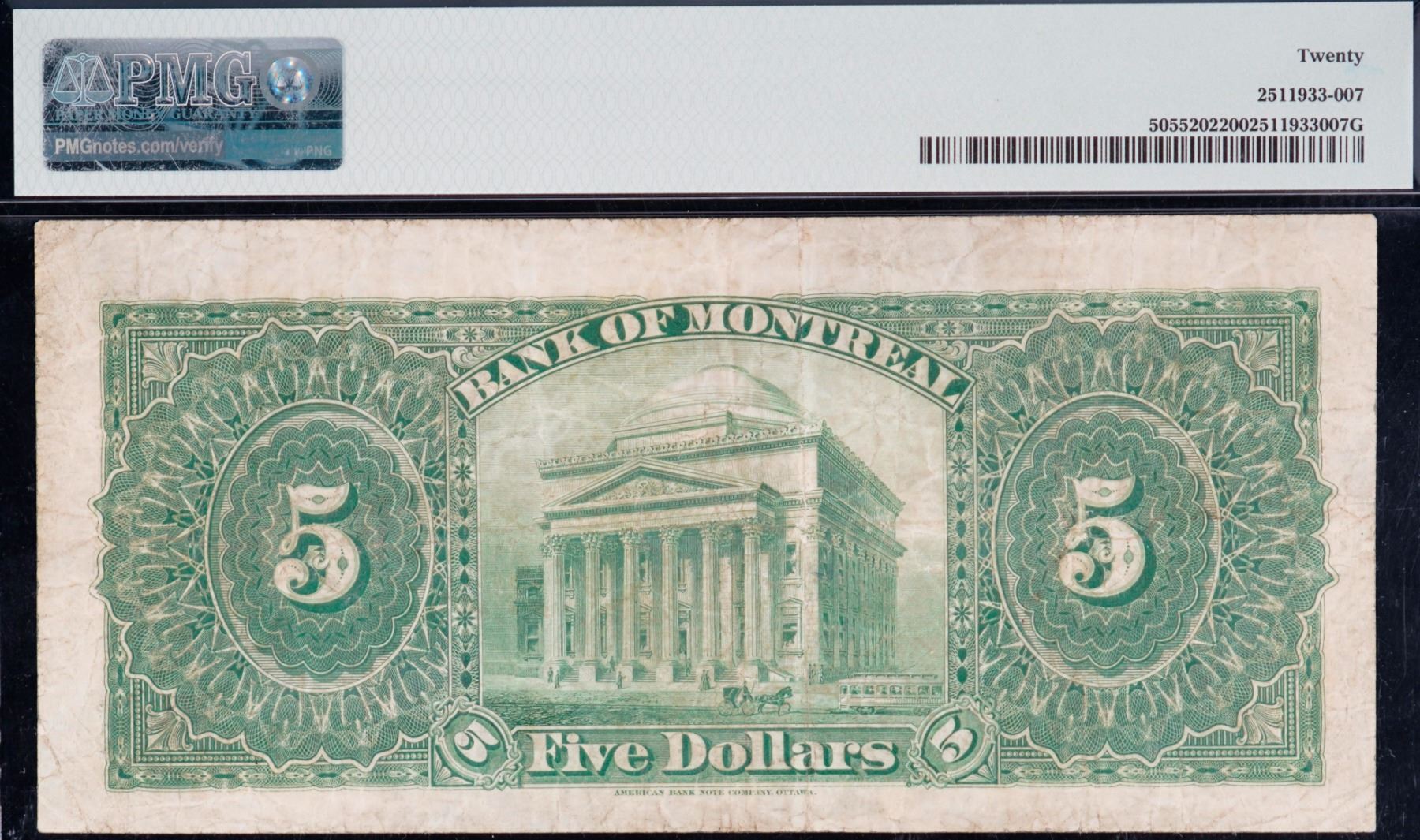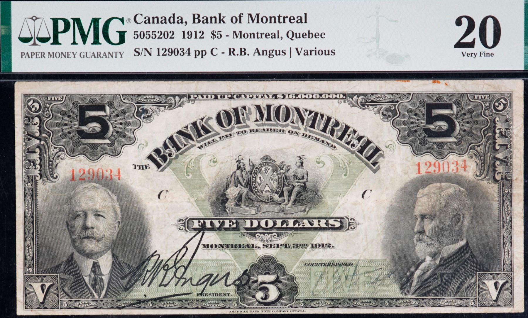 The Bank of Montreal 1912 $5 #129034 CH-505-52-02 PMG Very Fine-20 - Scarce date and seldom seen on the market.